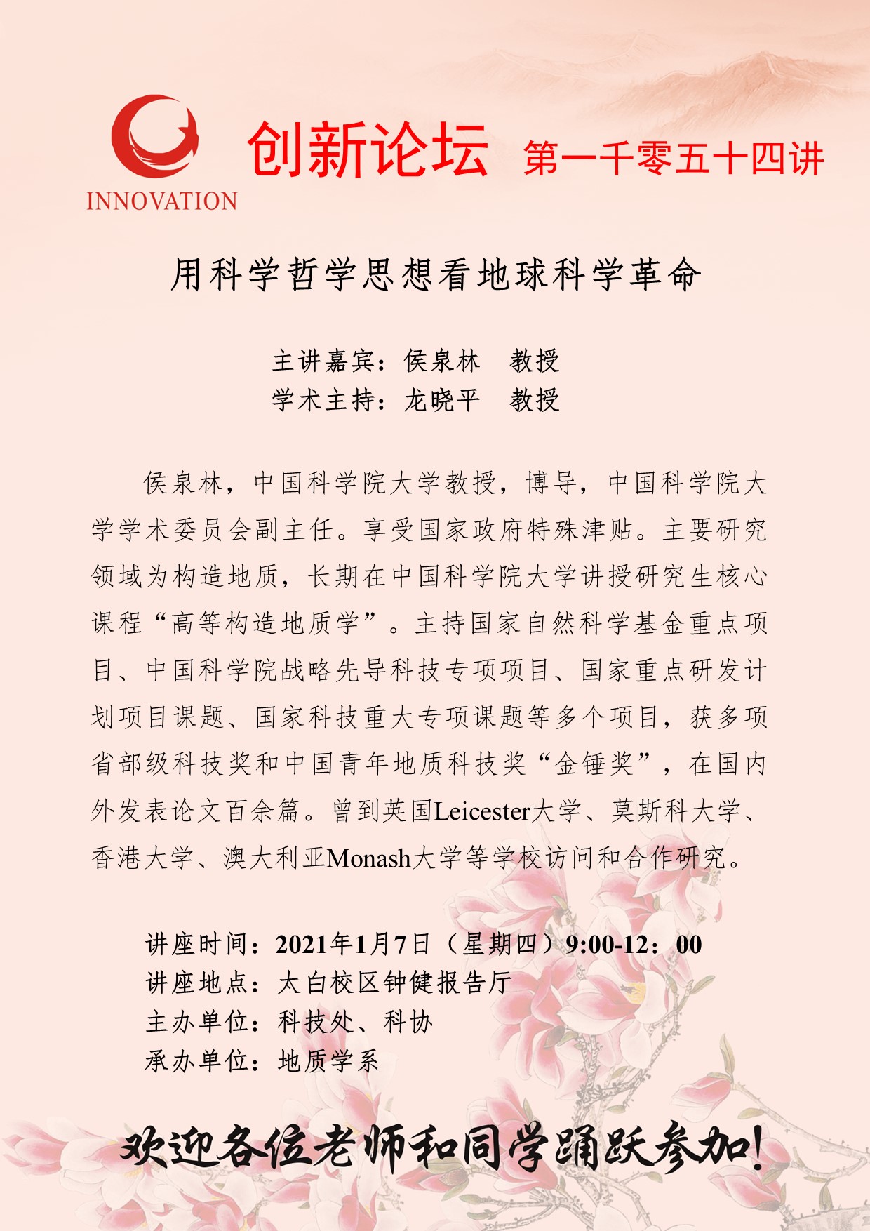 侯泉林 教授 赢博官方(中国)总部创新论坛第一千零五十四讲:用科学哲学思想看地球科学革命 讲座时间 2021年1月7日(星期四) 9:00-12:00 讲座地点 太白校区钟健报告厅 讲座人介绍 侯泉林 教授 讲座内容