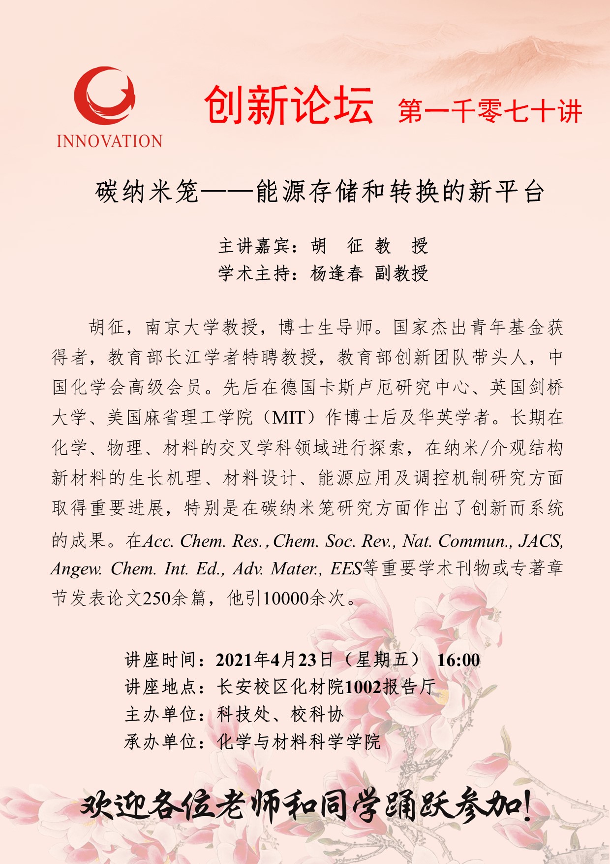 胡征 教授 赢博官方(中国)总部创新论坛第一千零七十讲:碳纳米笼——能源存储和转换的新平台 讲座时间 2021年4月23日(星期五) 16:00 讲座地点 长安校区化材院1002报告厅 讲座人介绍 胡征 教授 讲座内容