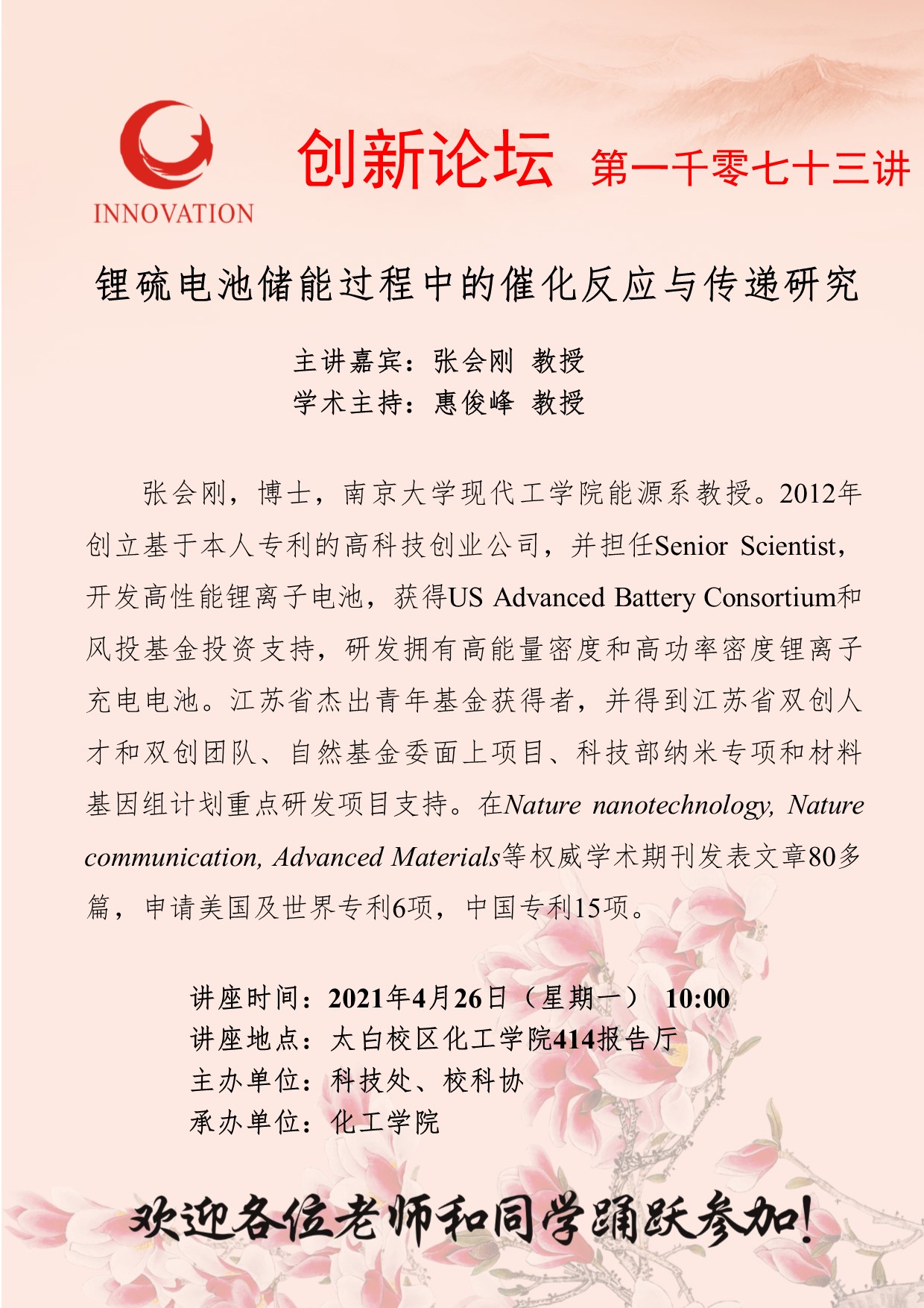 张会刚 教授 赢博官方(中国)总部创新论坛第一千零七十三讲:锂硫电池储能过程中的催化反应与传递研究 讲座时间 2021年4月26日(星期一) 10:00 讲座地点 太白校区化工学院414报告厅 讲座人介绍 张会刚 教授 讲座内容