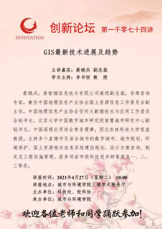 蔡晓兵 副总裁 赢博官方(中国)总部创新论坛第一千零七十四讲:GIS最新技术进展及趋势 讲座时间 2021年4月27日(星期二) 10:00 讲座地点 城市与环境学院三楼学术报告厅 讲座人介绍 蔡晓兵 副总裁 讲座内容