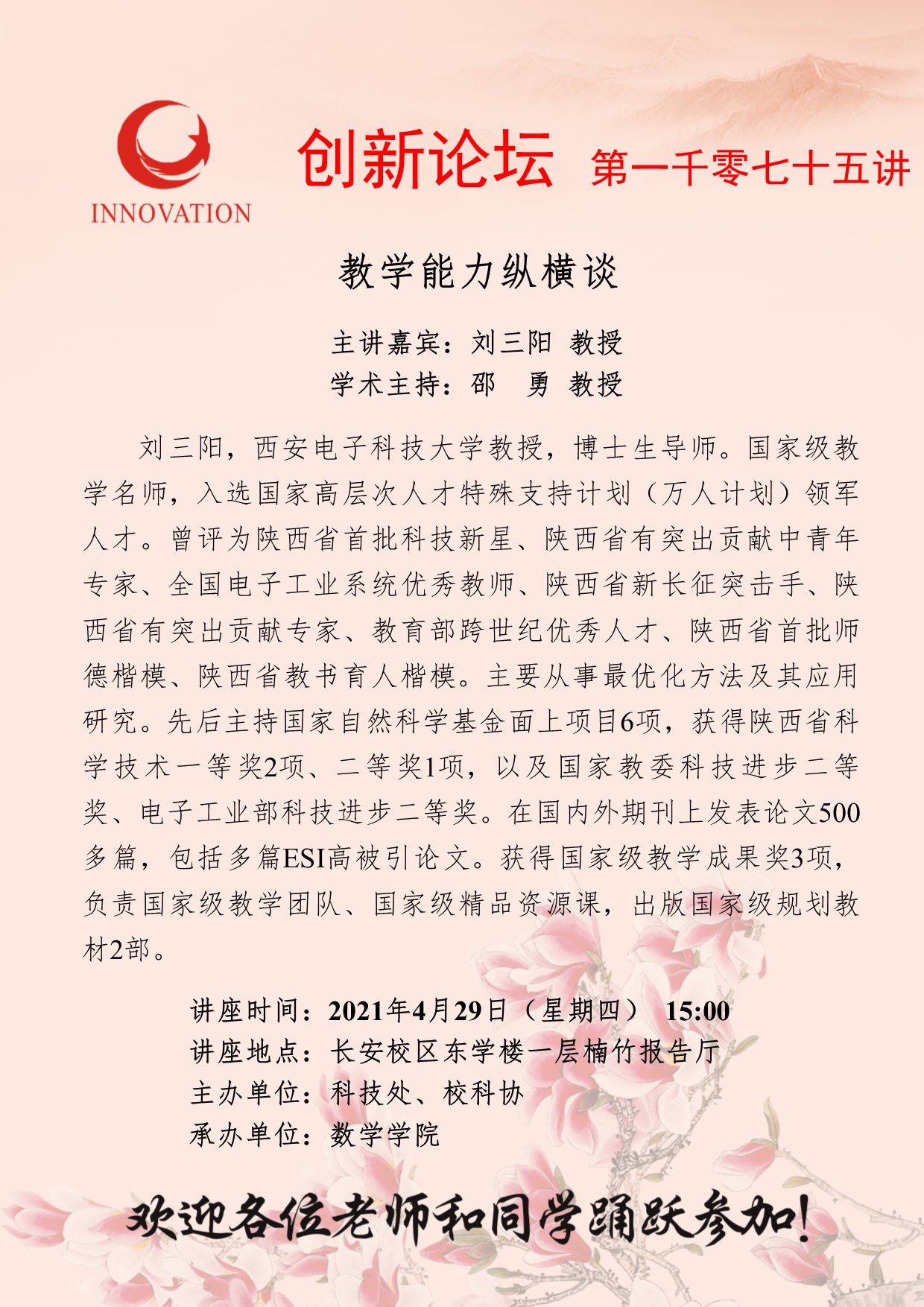 刘三阳 教授 赢博官方(中国)总部创新论坛第一千零七十五讲:教学能力纵横谈 讲座时间 2021年4月29日(星期四) 15:00 讲座地点 长安校区东学楼一层楠竹报告厅 讲座人介绍 刘三阳 教授 讲座内容