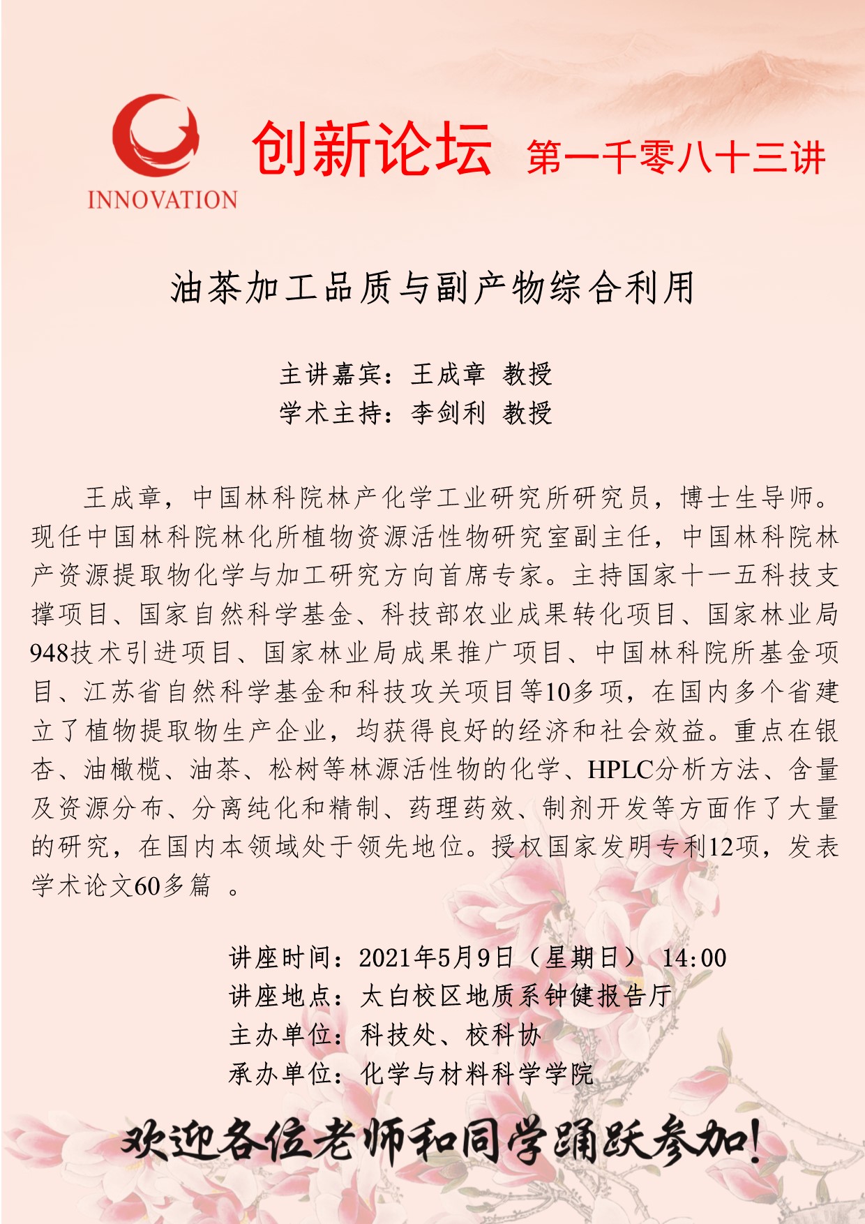 王成章 教授 赢博官方(中国)总部创新论坛第一千零八十三讲:油茶加工品质与副产物综合利用 讲座时间 2021年5月9日(星期日) 14:00 讲座地点 太白校区地质系钟健报告厅 讲座人介绍 王成章 教授 讲座内容