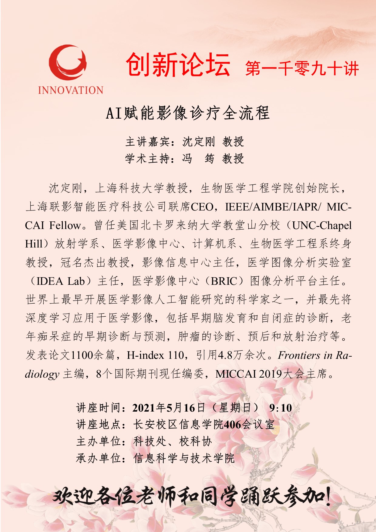 沈定刚 教授 赢博官方(中国)总部创新论坛第一千零九十讲:AI赋能影像诊疗全流程 讲座时间 2021年5月16日(星期日) 9:10 讲座地点 长安校区信息学院406会议室 讲座人介绍 沈定刚 教授 讲座内容