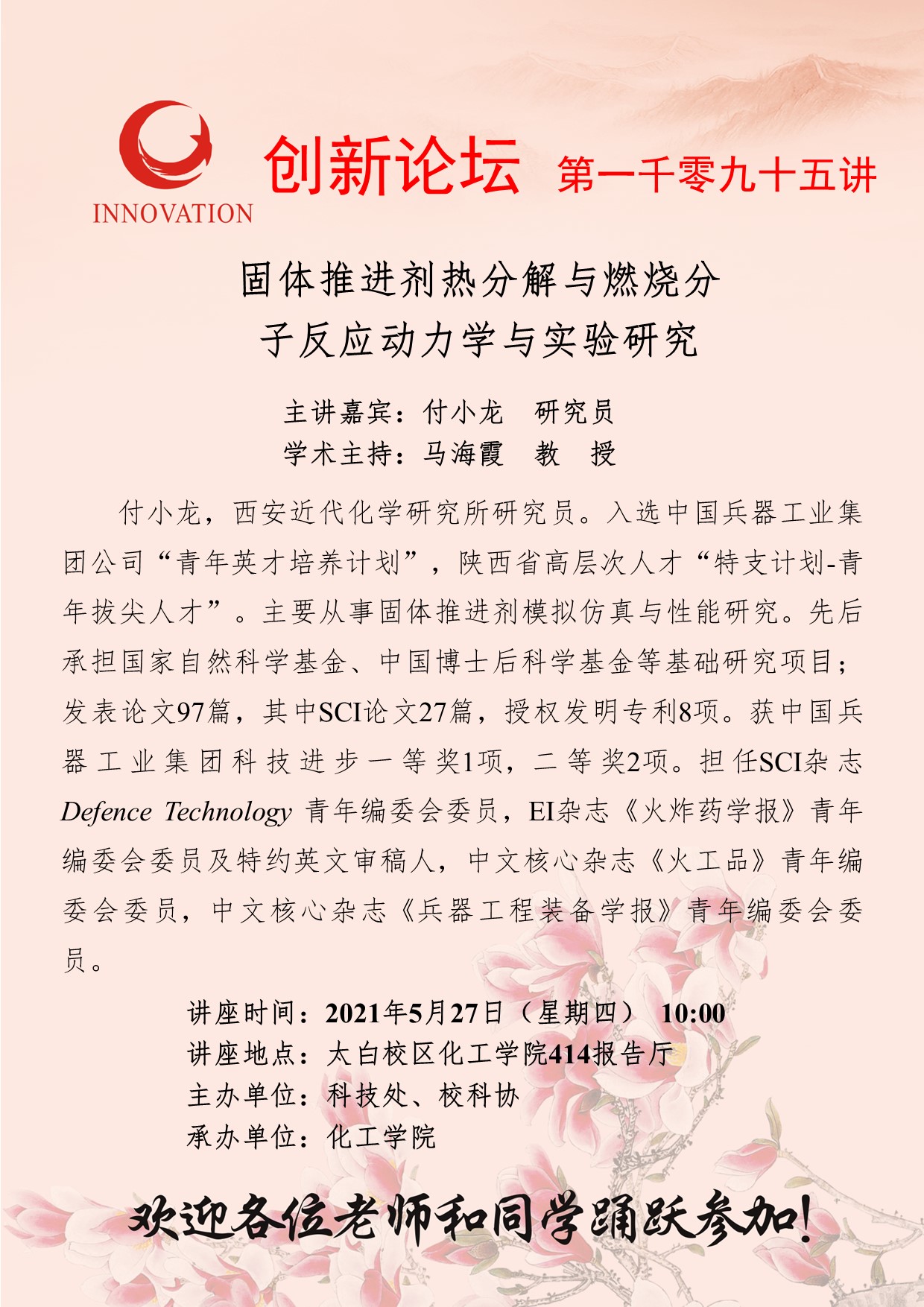 付小龙 研究员 赢博官方(中国)总部创新论坛第一千零九十五讲:固体推进剂热分解与燃烧分子反应动力学与实验研究 讲座时间 2021年5月27日(星期四) 10:00 讲座地点 太白校区化工学院414报告厅 讲座人介绍 付小龙 研究员 讲座内容