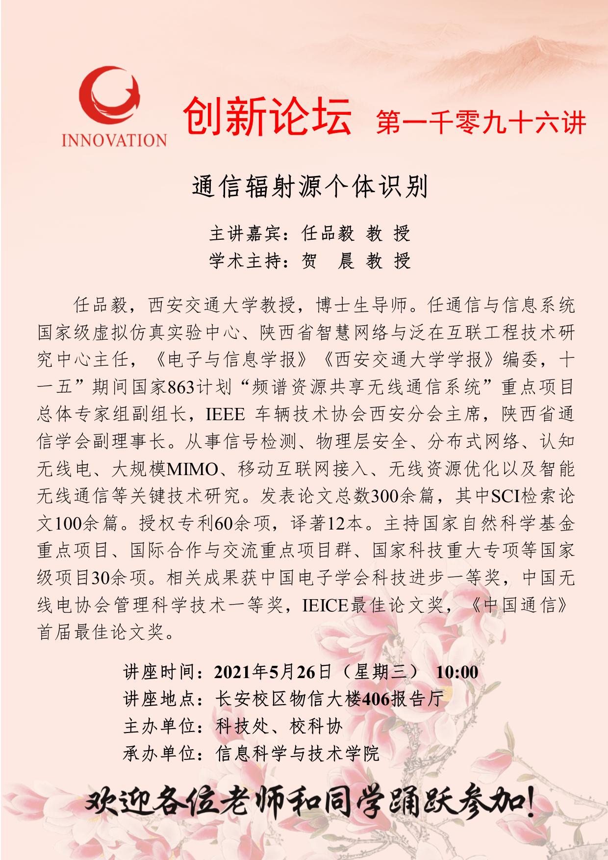 任品毅 教 授 赢博官方(中国)总部创新论坛第一千零九十六讲:通信辐射源个体识别 讲座时间 2021年5月26日(星期三) 10:00 讲座地点 长安校区物信大楼406报告厅 讲座人介绍 任品毅 教 授 讲座内容