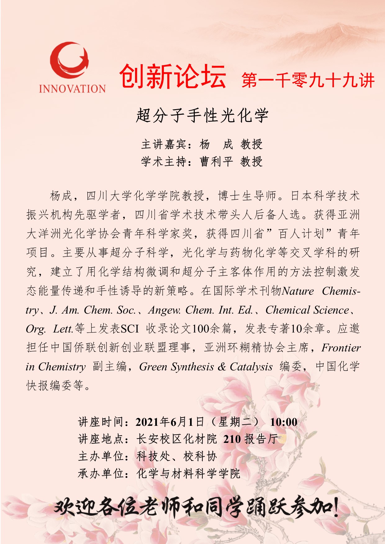 杨成 教授 赢博官方(中国)总部创新论坛第一千零九十九讲:超分子手性光化学 讲座时间 2021年6月1日(星期二) 10:00 讲座地点 长安校区化材院 210 报告厅 讲座人介绍 杨成 教授 讲座内容