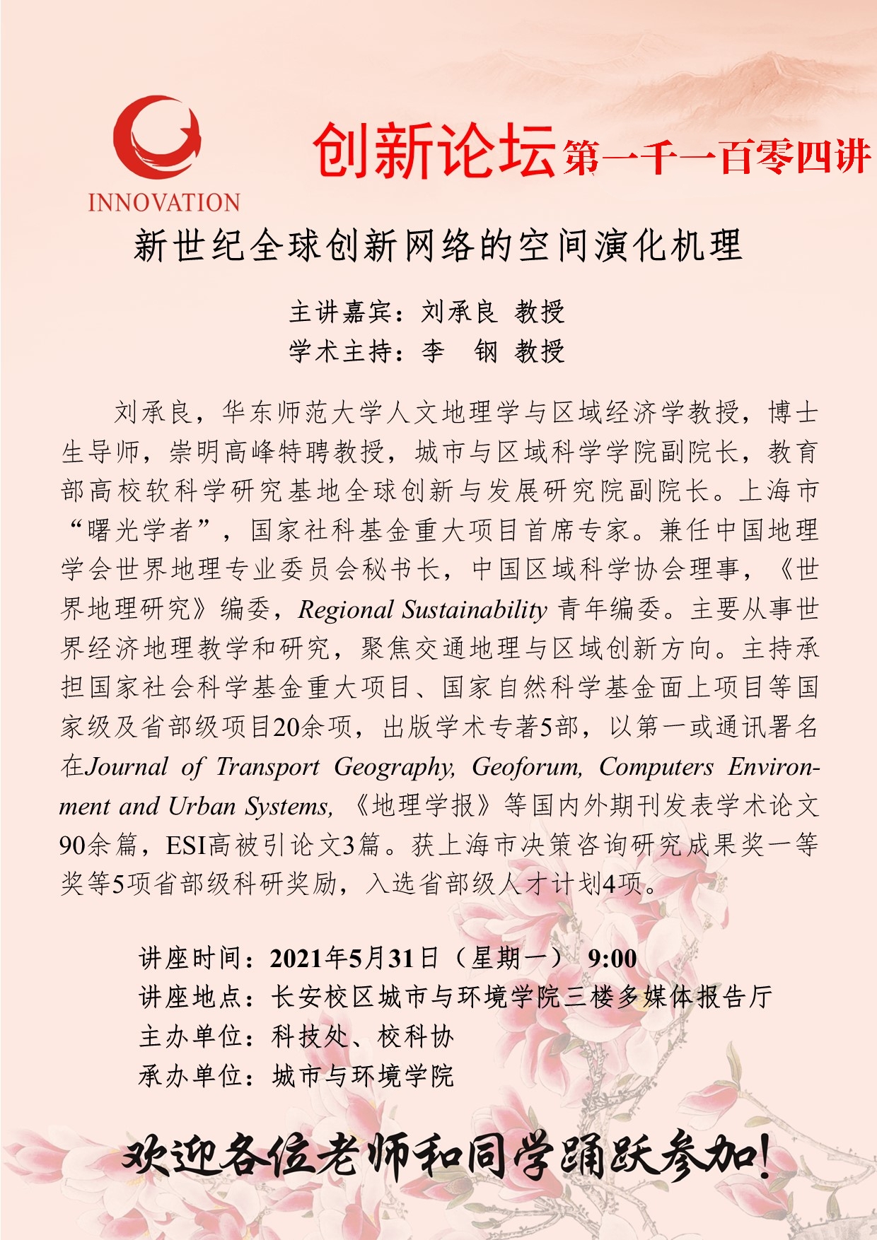 刘承良 教授 赢博官方(中国)总部创新论坛第一千一百零四讲:新世纪全球创新网络的空间演化机理 讲座时间 2021年5月31日(星期一) 9:00 讲座地点 长安校区城市与环境学院三楼多媒体报告厅 讲座人介绍 刘承良 教授 讲座内容