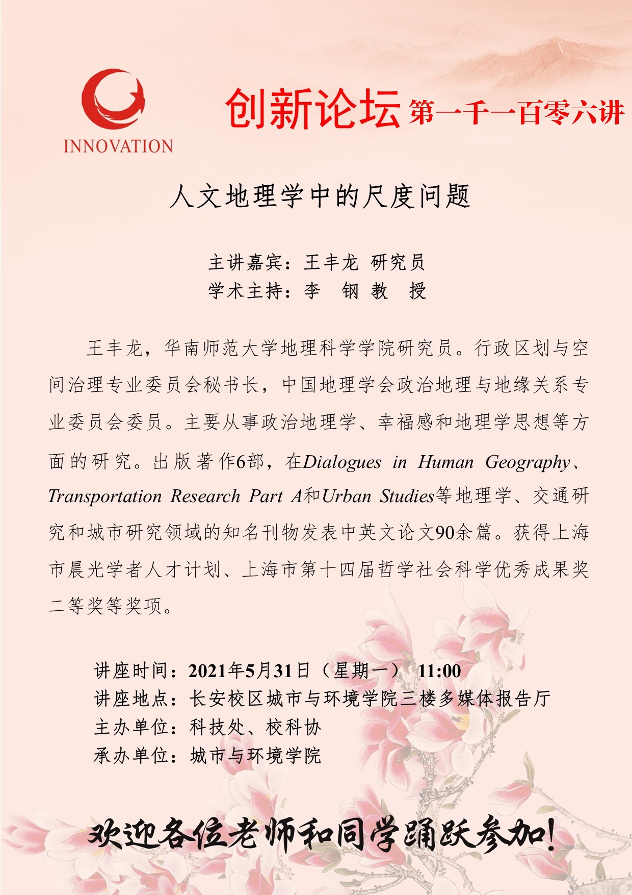 王丰龙 研究员 赢博官方(中国)总部创新论坛第一千一百零六讲:人文地理学中的尺度问题 讲座时间 2021年5月31日(星期一) 11:00 讲座地点 长安校区城市与环境学院三楼多媒体报告厅 讲座人介绍 王丰龙 研究员 讲座内容