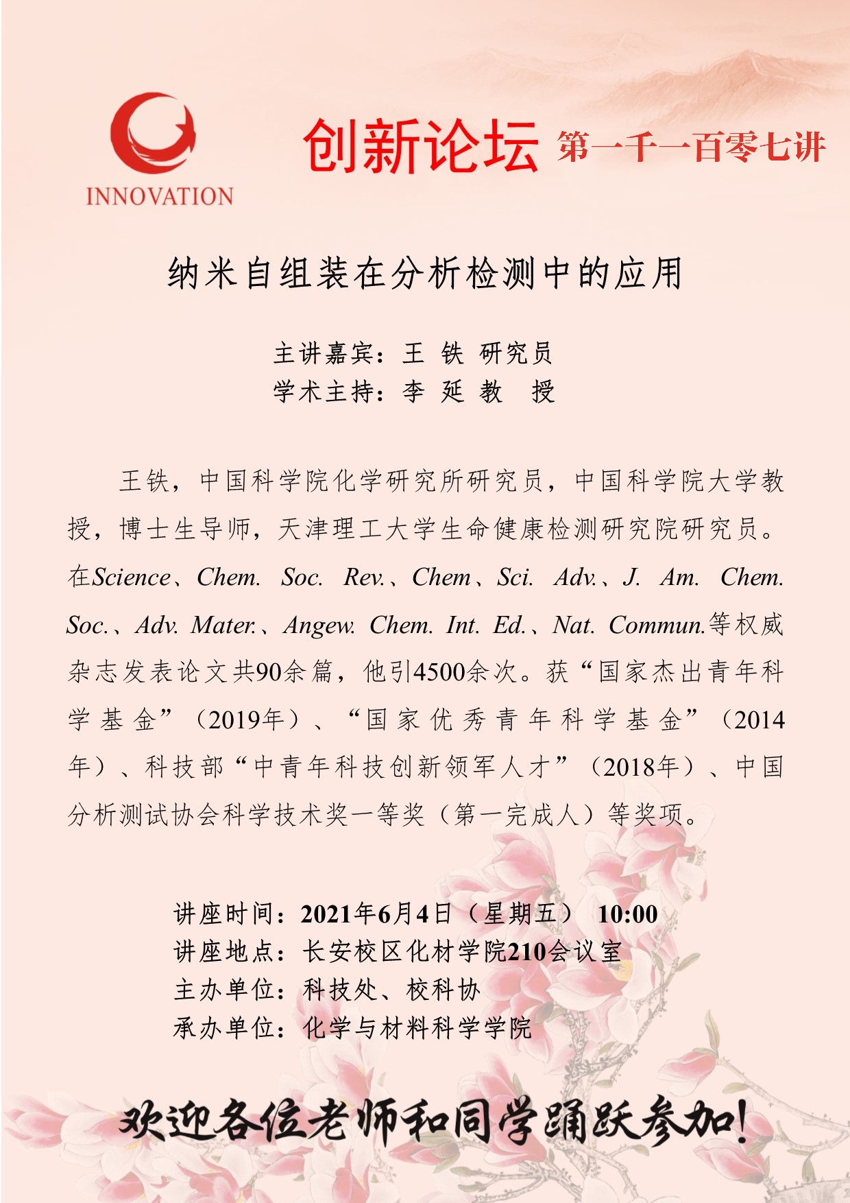 王 铁 研究员 赢博官方(中国)总部创新论坛第一千一百零七讲:纳米自组装在分析检测中的应用 讲座时间 2021年6月4日(星期五) 10:00 讲座地点 长安校区化材学院210会议室 讲座人介绍 王 铁 研究员 讲座内容