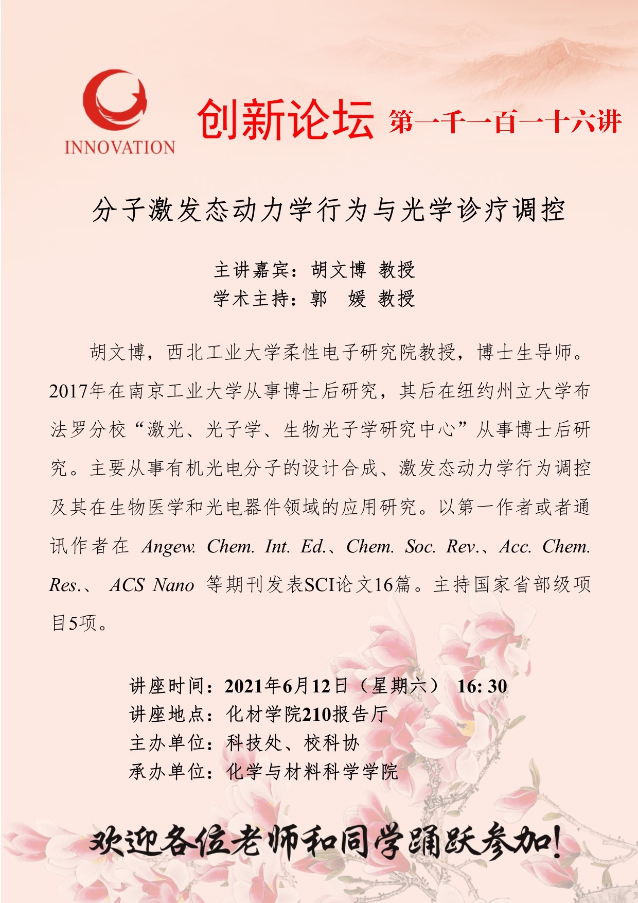 胡文博 教授 赢博官方(中国)总部创新论坛第一千一百一十六讲:分子激发态动力学行为与光学诊疗调控 讲座时间 2021年6月12日(星期六) 16:30 讲座地点 化材学院210报告厅 讲座人介绍 胡文博 教授 讲座内容
