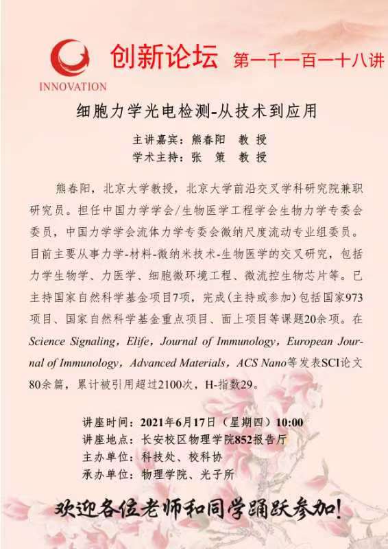 熊春阳 教 授 赢博官方(中国)总部创新论坛第一千一百一十八讲:细胞力学光电检测-从技术到应用 讲座时间 2021年6月17日(星期四)10:00 讲座地点 长安校区物理学院852报告厅 讲座人介绍 熊春阳 教 授 讲座内容