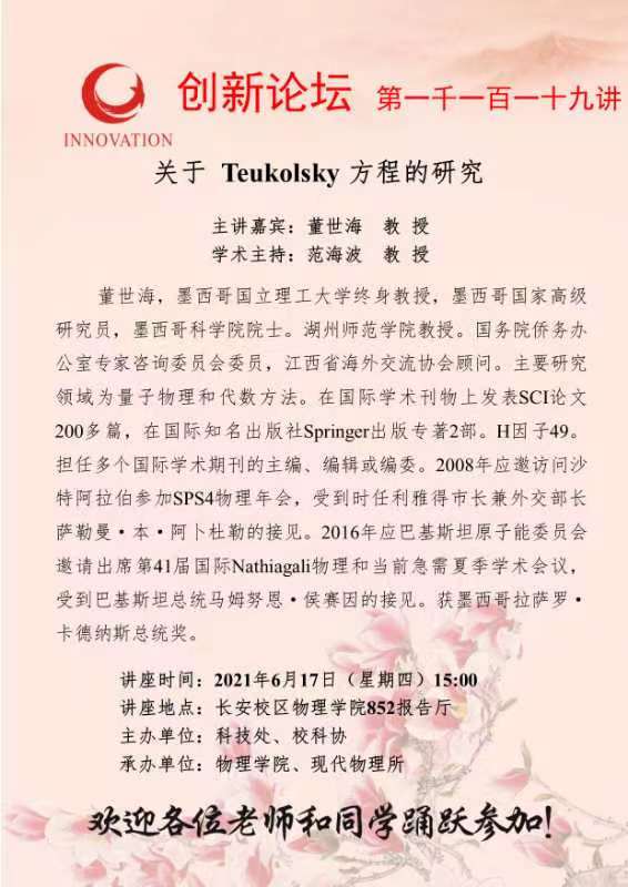 董世海 教 授 赢博官方(中国)总部创新论坛第一千一百一十九讲:关于 Teukolsky 方程的研究 讲座时间 2021年6月17日(星期四)15:00 讲座地点 长安校区物理学院852报告厅 讲座人介绍 董世海 教 授 讲座内容