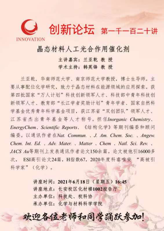 兰亚乾 教 授 赢博官方(中国)总部创新论坛第一千一百二十讲:晶态材料人工光合作用催化剂 讲座时间 2021年6月18日(星期五)16:45 讲座地点 长安校区化材楼1002报告厅 讲座人介绍 兰亚乾 教 授 讲座内容