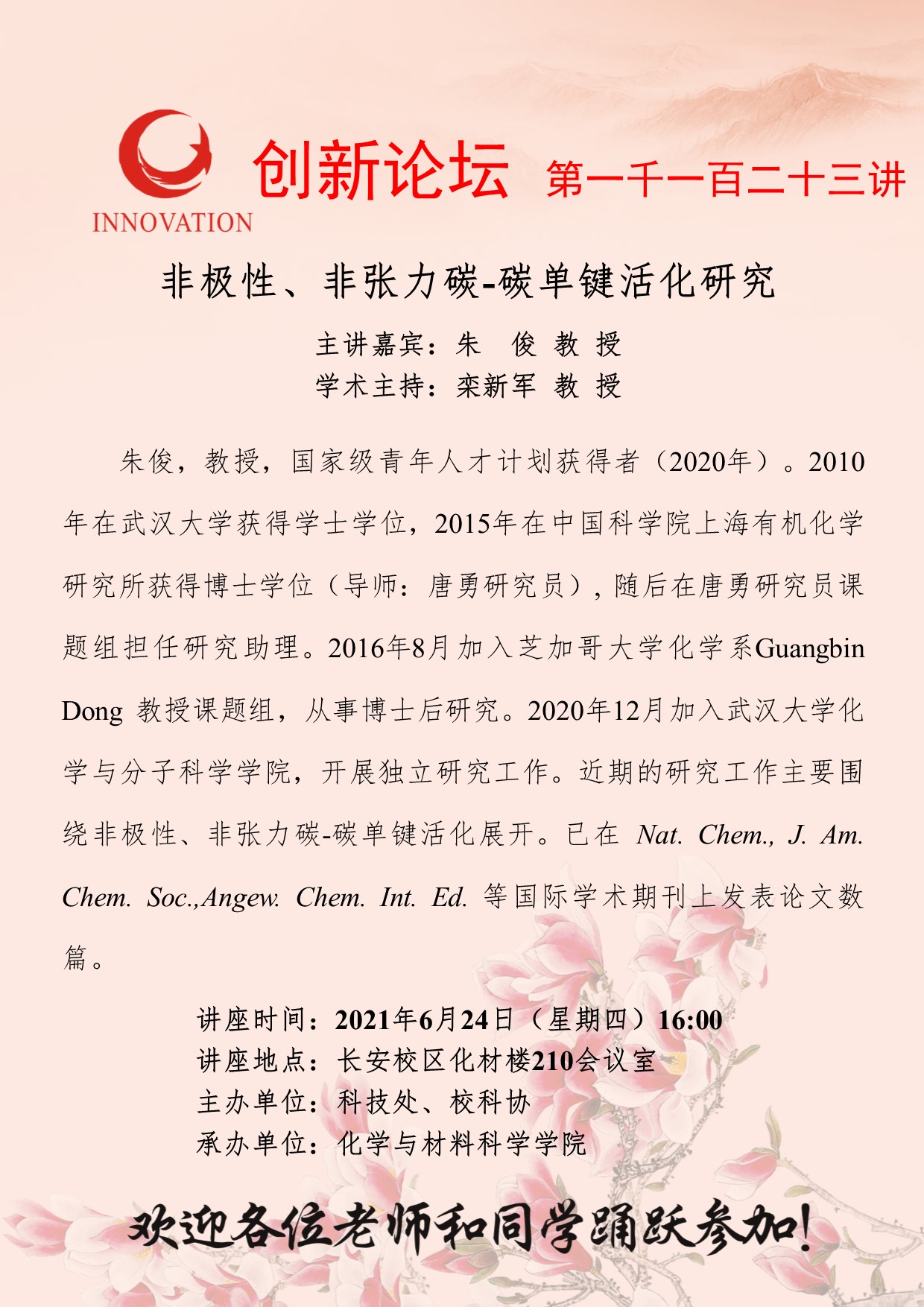朱 俊 教 授 赢博官方(中国)总部创新论坛第一千一百二十三讲:非极性、非张力碳-碳单键活化研究 讲座时间 2021年6月24日(星期四)16:00 讲座地点 长安校区化材楼210会议室 讲座人介绍 朱 俊 教 授 讲座内容