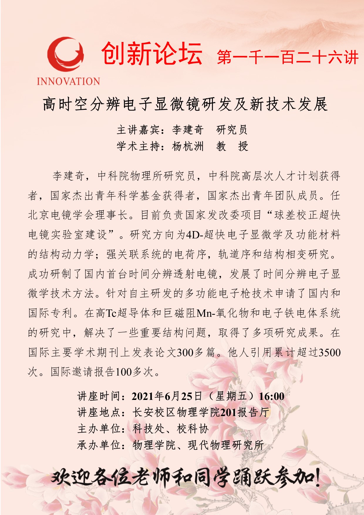 李建奇 研究员 赢博官方(中国)总部创新论坛第一千一百二十六讲:高时空分辨电子显微镜研发及新技术发展 讲座时间 2021年6月25日(星期五)16:00 讲座地点 长安校区物理学院201报告厅 讲座人介绍 李建奇 研究员 讲座内容