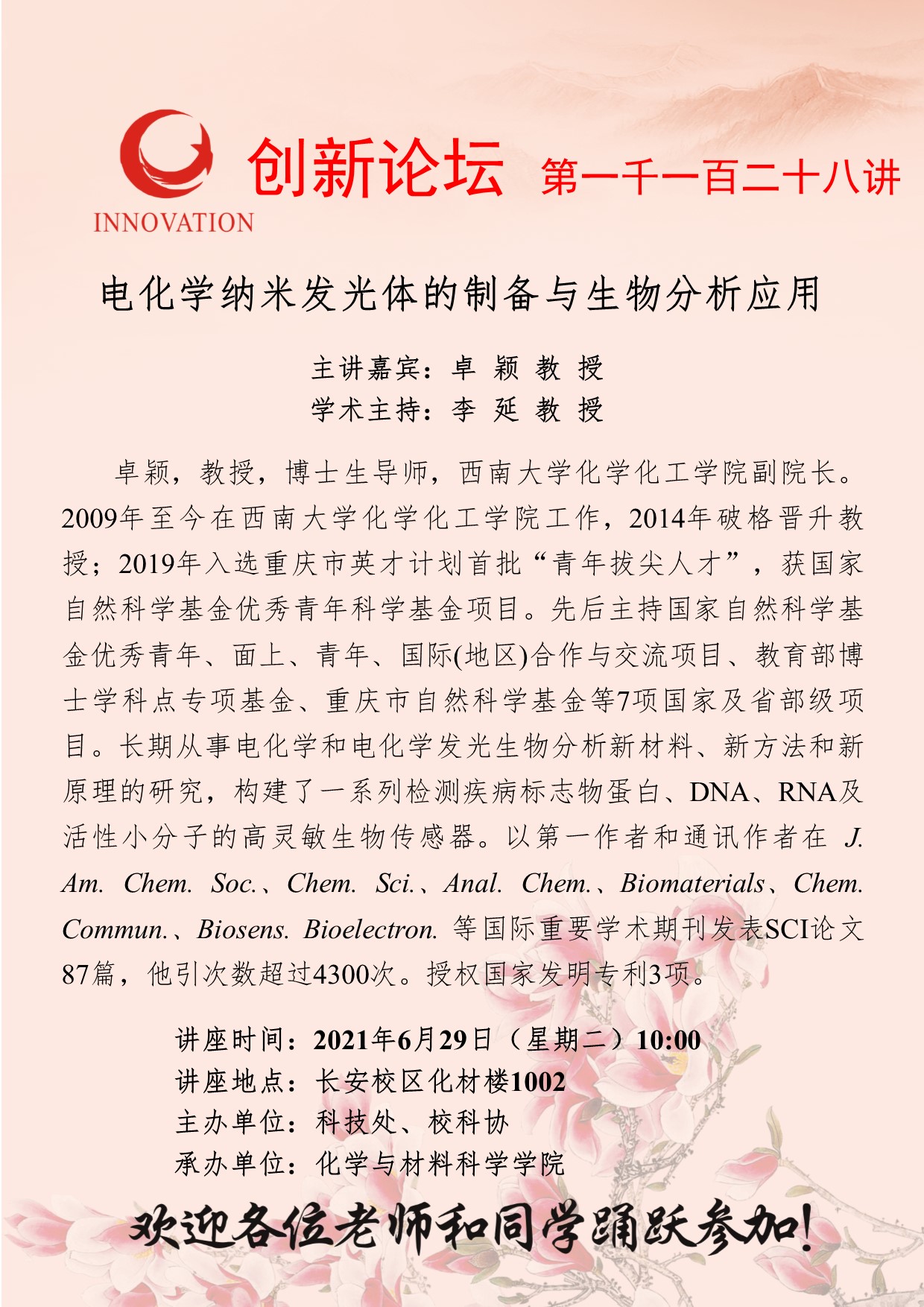 卓 颖 教 授 赢博官方(中国)总部创新论坛第一千一百二十八讲:电化学纳米发光体的制备与生物分析应用 讲座时间 2021年6月29日(星期二)10:00 讲座地点 长安校区化材楼1002 讲座人介绍 卓 颖 教 授 讲座内容