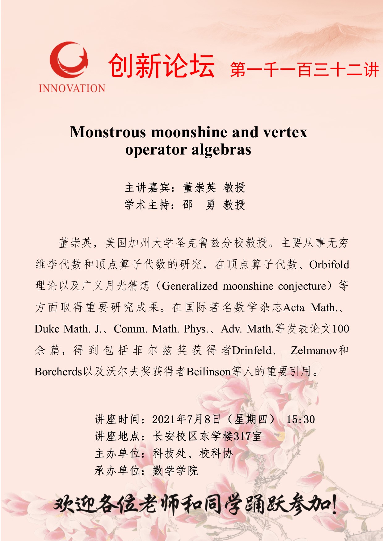 董崇英 教授 赢博官方(中国)总部创新论坛第一千一百三十二讲:Monstrous moonshine and vertex operator algebras 讲座时间 2021年7月8日(星期四) 讲座地点 长安校区东学楼317室 讲座人介绍 董崇英 教授 讲座内容