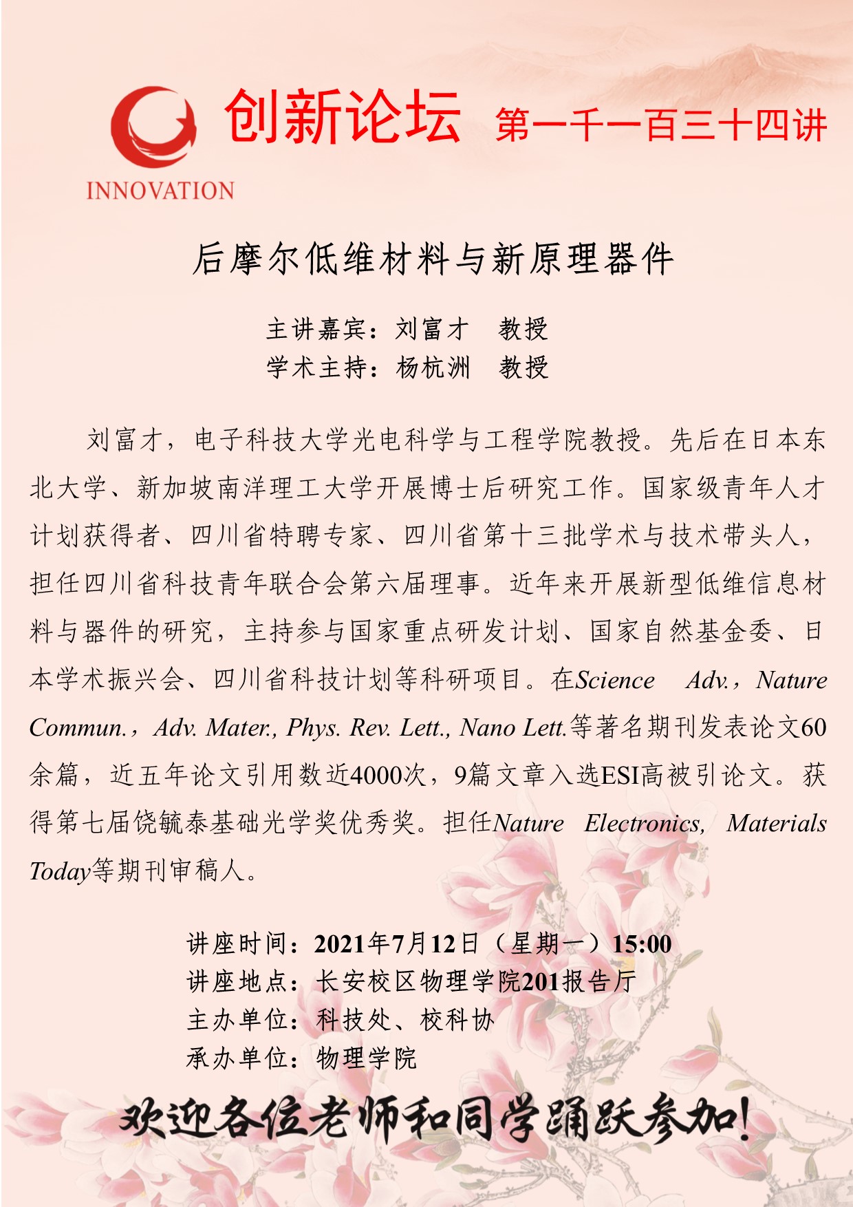 刘富才 教授 赢博官方(中国)总部创新论坛第一千一百三十四讲:后摩尔低维材料与新原理器件 讲座时间 2021年7月12日(星期一)15:00 讲座地点 长安校区物理学院201报告厅 讲座人介绍 刘富才 教授 讲座内容