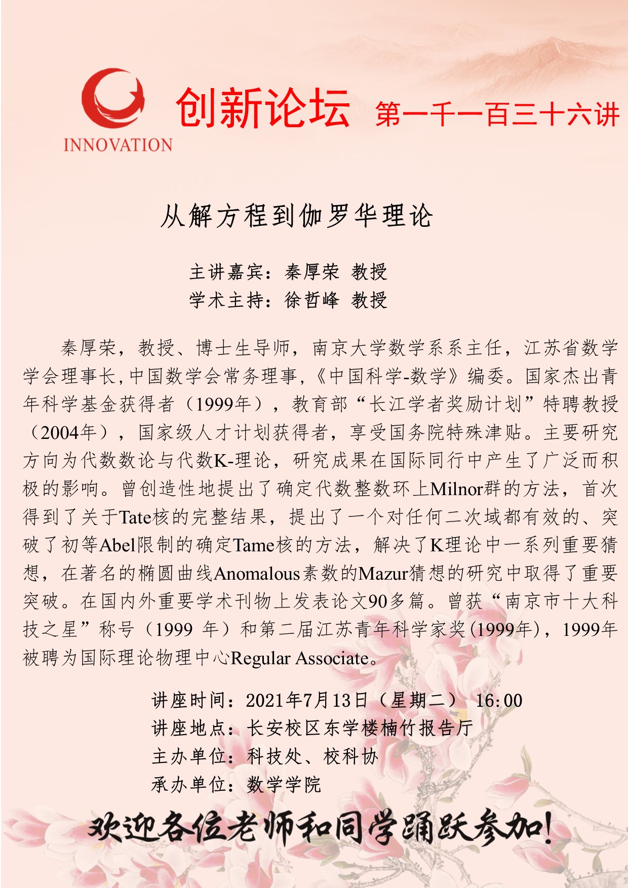 秦厚荣 教授 赢博官方(中国)总部创新论坛第一千一百三十六讲:从解方程到伽罗华理论 讲座时间 2021年7月13日 (星期二)16:00 讲座地点 长安校区东学楼楠竹报告厅 讲座人介绍 秦厚荣 教授 讲座内容