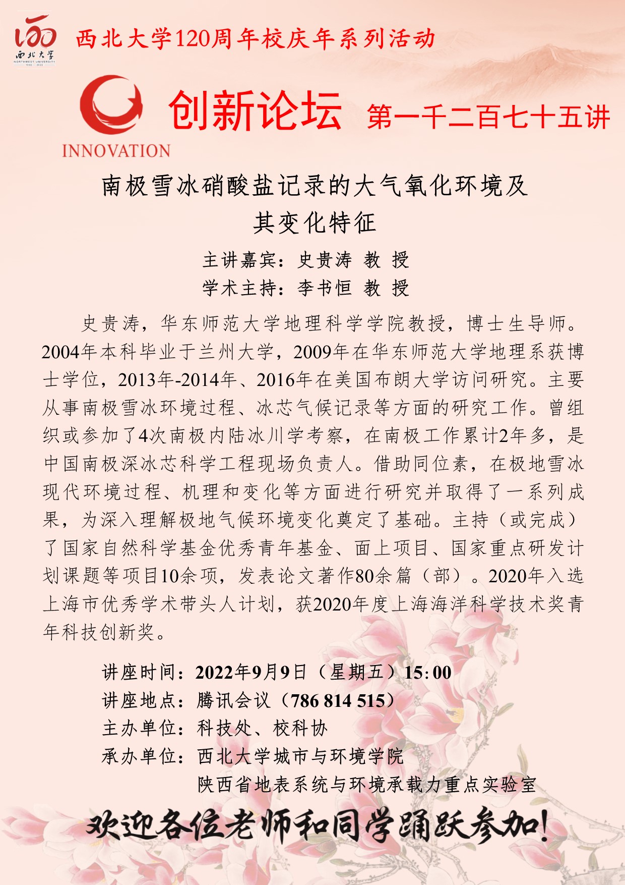 史贵涛 教 授 赢博官方(中国)总部创新论坛第一千二百七十五讲暨120周年校庆年系列活动:南极雪冰硝酸盐记录的大气氧化环境及其变化特征 讲座时间 2022年9月9日(星期五)15:00 讲座地点 讲座地点:腾讯会议(786 814 515) 讲座人介绍 史贵涛 教 授 讲座内容