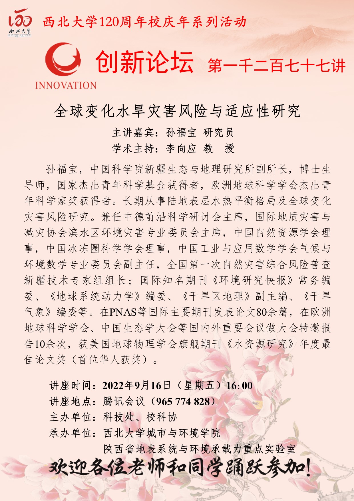 孙福宝 研究员 赢博官方(中国)总部创新论坛第一千二百七十七讲暨120周年校庆年系列活动:全球变化水旱灾害风险与适应性研究 讲座时间 2022年9月16日(星期五)16:00 讲座地点 腾讯会议(965 774 828) 讲座人介绍 孙福宝 研究员 讲座内容