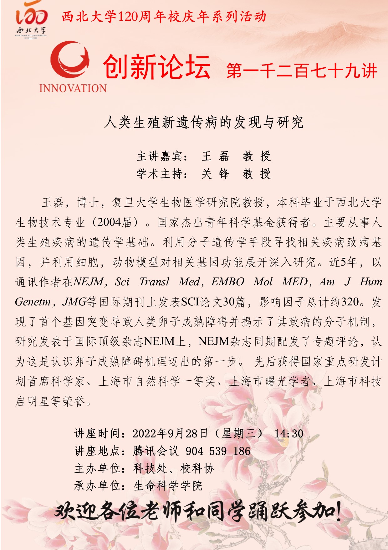 王 磊 教 授 赢博官方(中国)总部创新论坛第一千二百七十九讲暨120周年校庆年系列活动:人类生殖新遗传病的发现与研究 讲座时间 2022年9月28日(星期三) 14:30 讲座地点 腾讯会议 904 539 186 讲座人介绍 王 磊 教 授 讲座内容