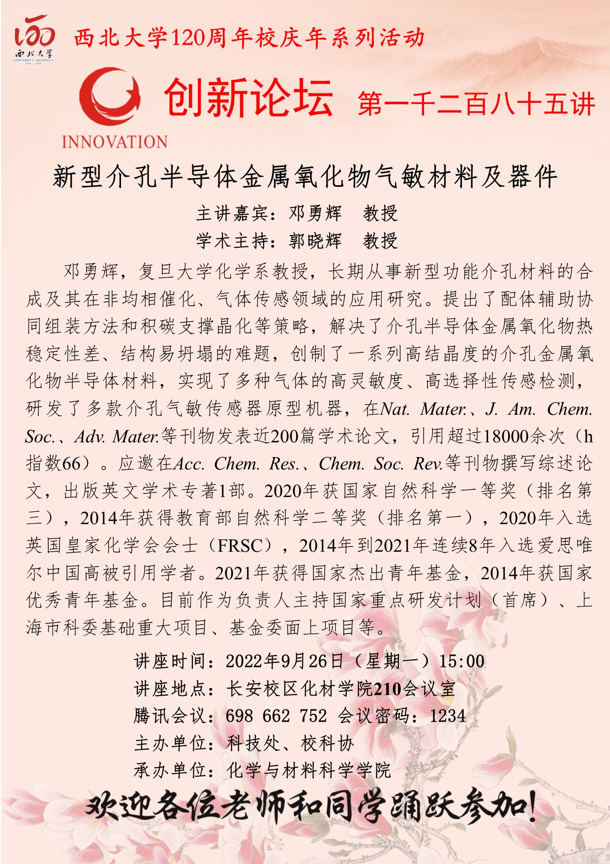 邓勇辉 教授 赢博官方(中国)总部创新论坛第一千二百八十五讲暨120周年校庆年系列活动::新型介孔半导体金属氧化物气敏材料及器件 讲座时间 2022年9月26日(星期一) 15:00 讲座地点 长安校区化材院210会议室(腾讯会议:698 662 752,会议密码:1234) 讲座人介绍 邓勇辉 教授 讲座内容