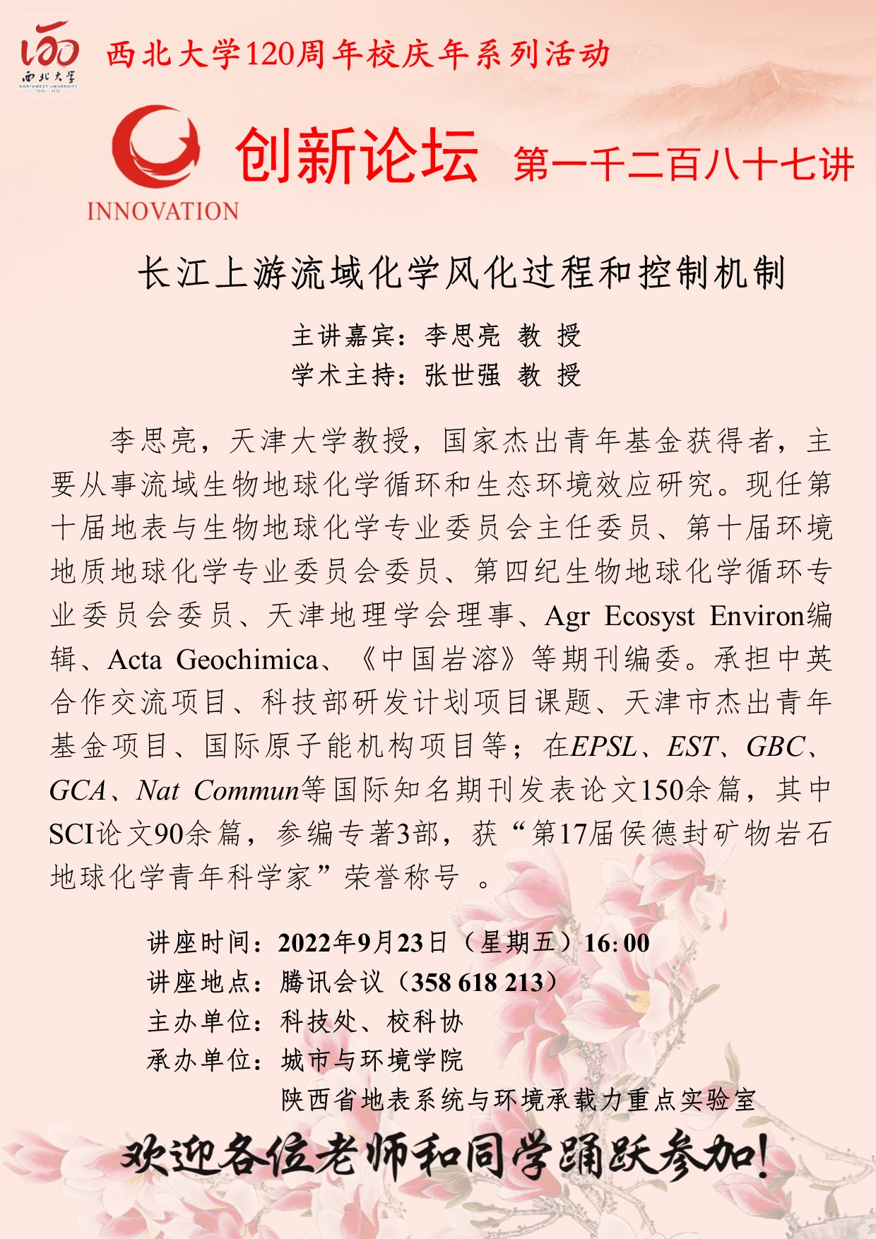 李思亮 教授 赢博官方(中国)总部创新论坛第一千二百八十七讲暨120周年校庆年系列活动: 长江上游流域化学风化过程和控制机制 讲座时间 2022年9月23日(星期五)16:00 讲座地点 腾讯会议(358 618 213) 讲座人介绍 李思亮 教授 讲座内容