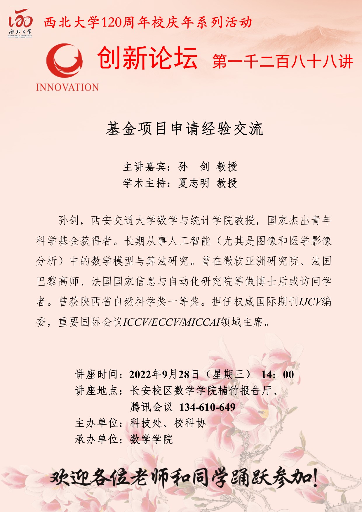 孙 剑 教授 赢博官方(中国)总部创新论坛第一千二百八十八讲暨120周年校庆年系列活动:基金项目申请经验交流 讲座时间 2022年9月28日(星期三) 14:00 讲座地点 长安校区数学学院楠竹报告厅、腾讯会议 134-610-649 讲座人介绍 孙 剑 教授 讲座内容