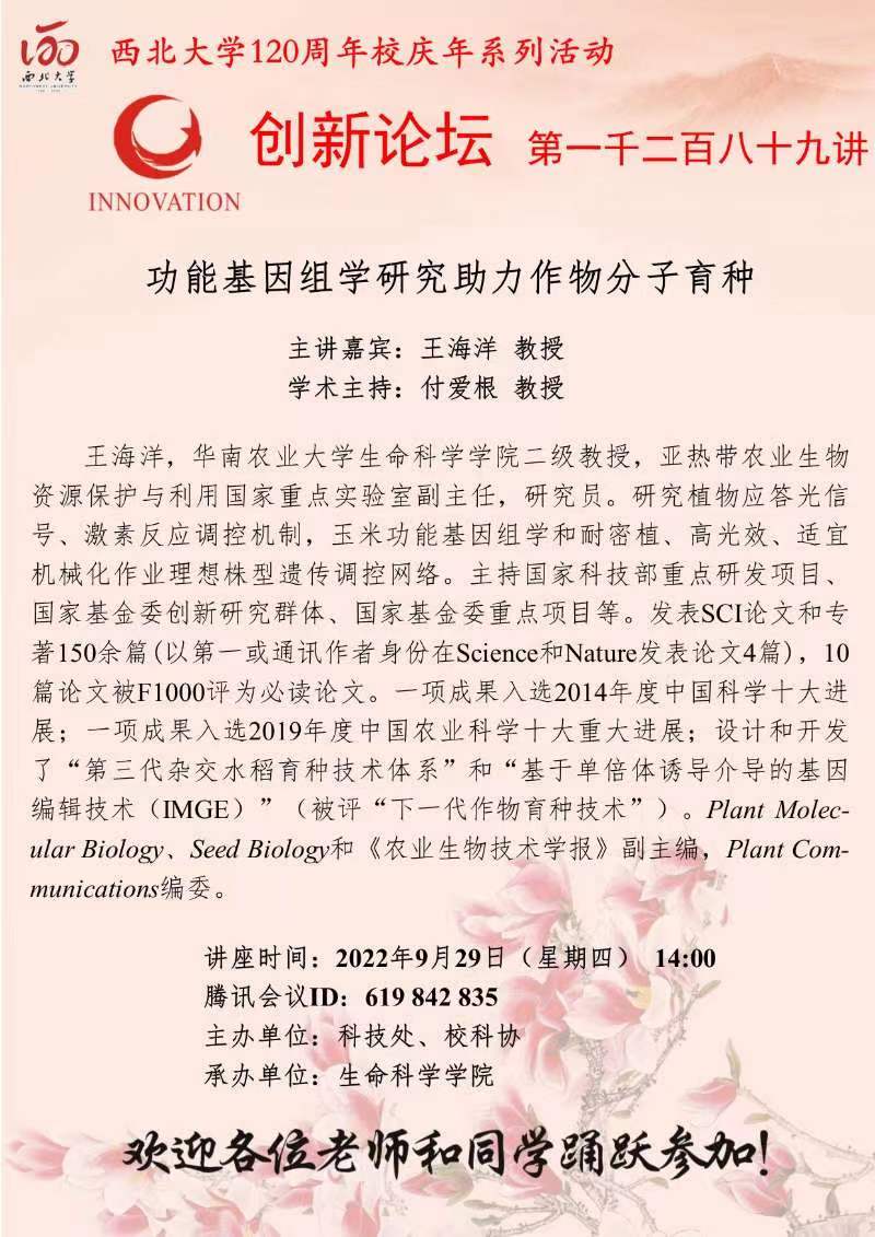 王海洋 教授 赢博官方(中国)总部创新论坛第一千二百八十九讲暨120周年校庆年系列活动: 功能基因组学研究助力作物分子育种 讲座时间 2022年9月29日(星期四) 14:00 讲座地点 腾讯会议 619 842 835 讲座人介绍 王海洋 教授 讲座内容