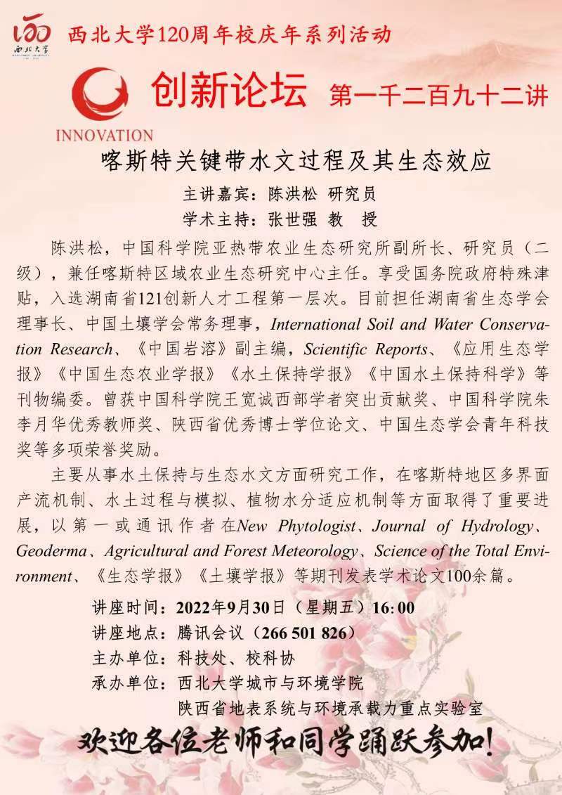 陈洪松 教授 赢博官方(中国)总部创新论坛第一千二百九十二讲暨120周年校庆年系列活动: 喀斯特关键带水文过程及其生态效应 讲座时间 2022年9月30日(星期五) 16:00 讲座地点 腾讯会议 266 501 826 讲座人介绍 陈洪松 教授 讲座内容