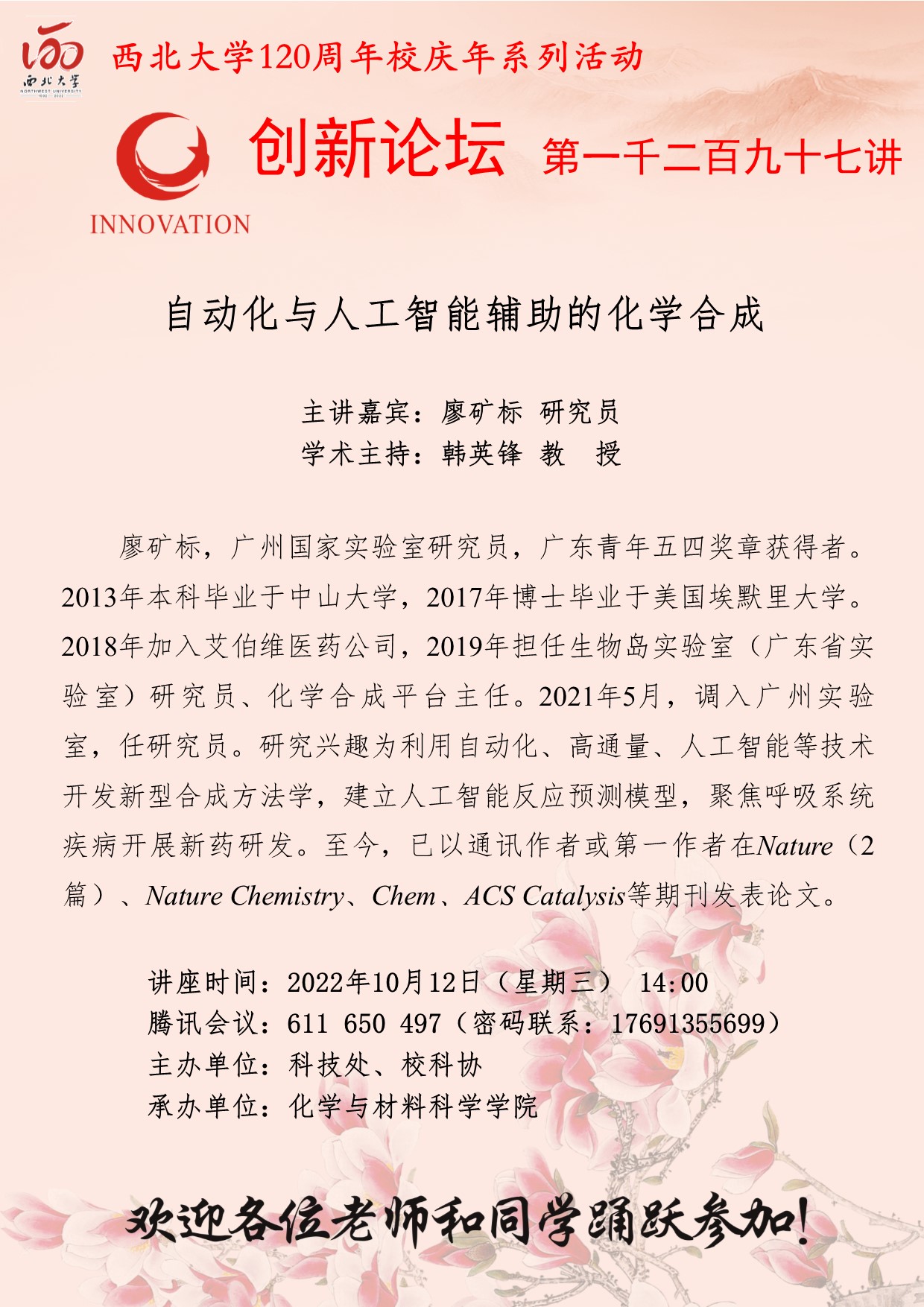 廖矿标 研究员 赢博官方(中国)总部创新论坛第一千二百九十七讲暨120周年校庆年系列活动: 自动化与人工智能辅助的化学合成 讲座时间 2022年10月12日(星期三) 14:00 讲座地点 腾讯会议 611 650 497 讲座人介绍 廖矿标 研究员 讲座内容