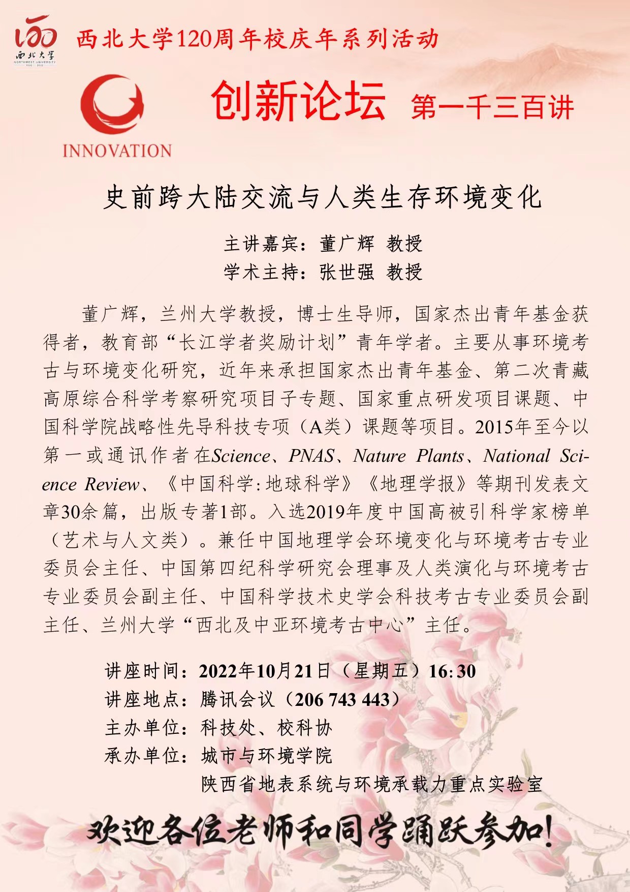 董广辉 教授 赢博官方(中国)总部创新论坛第一千三百讲暨120周年校庆年系列活动: 史前跨大陆交流与人类生存环境变化 讲座时间 2022年10月21日(星期五)16:30 讲座地点 腾讯会议 206 743 443 讲座人介绍 董广辉 教授 讲座内容