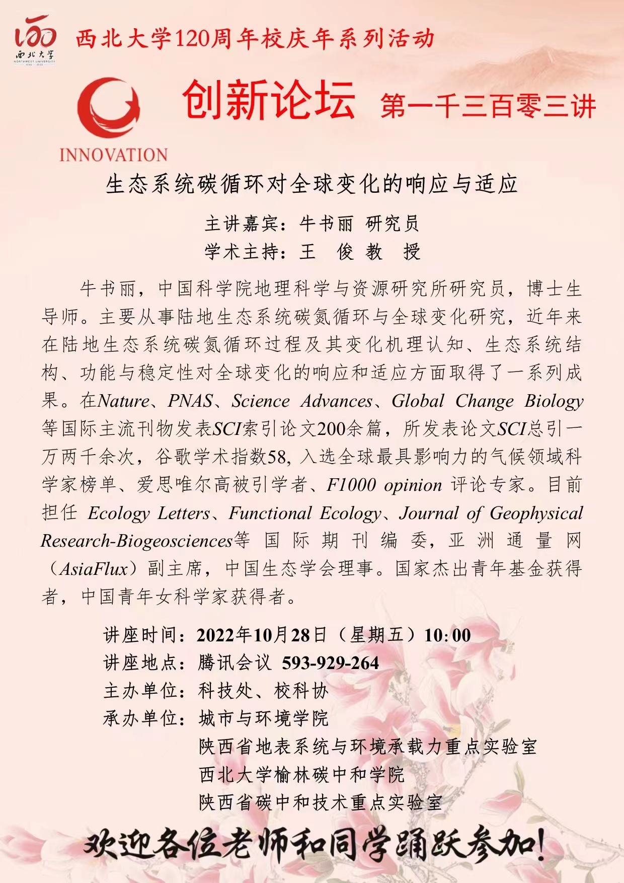 牛书丽 研究员 赢博官方(中国)总部创新论坛第一千三百零三讲暨120周年校庆年系列活动: 生态系统碳循环对全球变化的响应与适应 讲座时间 2022年10月28日(星期五) 10:00 讲座地点 腾讯会议 593-929-264 讲座人介绍 牛书丽 研究员 讲座内容