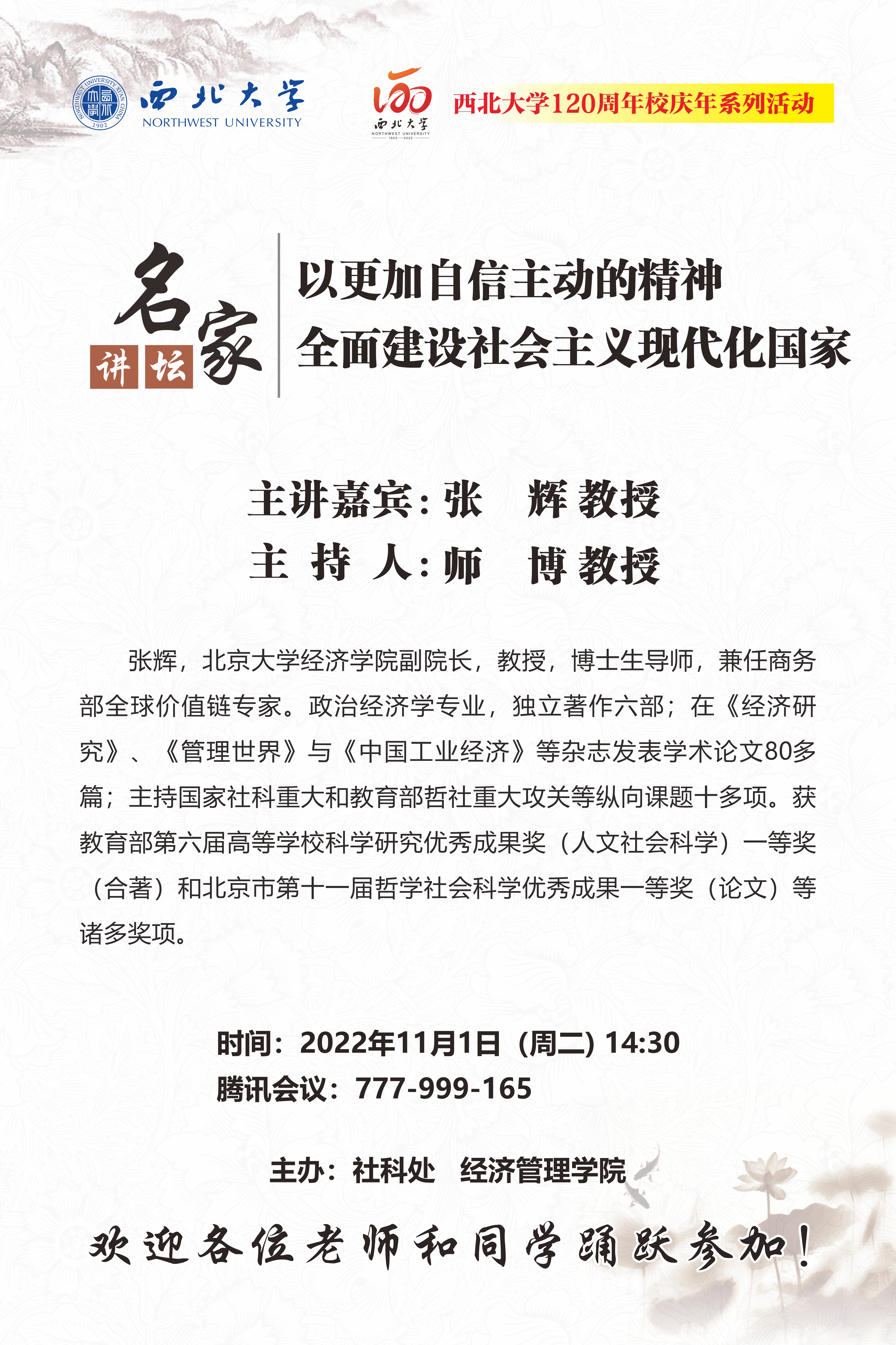 张辉 教授 赢博官方(中国)总部120周年校庆年系列活动:以更加自信主动的精神全面建设社会主义现代化国家 讲座时间 2022年11月1日(周二)14:30 讲座地点 腾讯会议:777-999-165 讲座人介绍 张辉 教授 讲座内容