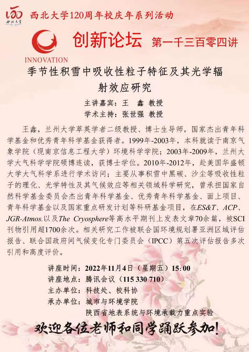 王 鑫 教授 赢博官方(中国)总部创新论坛第一千三百零四讲暨120周年校庆年系列活动: 季节性积雪中吸收性粒子特征及其光学辐射效应研究 讲座时间 2022年11月4日(星期五)15:00 讲座地点 腾讯会议 115 330 710 讲座人介绍 王 鑫 教授 讲座内容