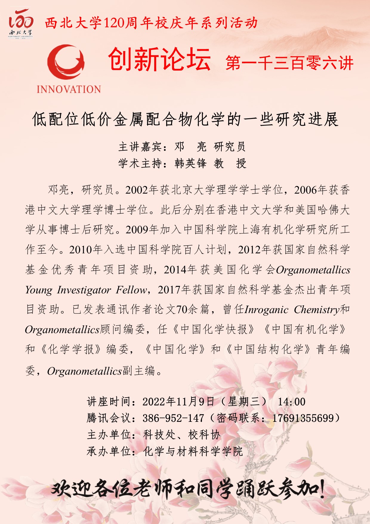 邓亮 研究员 赢博官方(中国)总部创新论坛第一千三百零六讲暨120周年校庆年系列活动: 低配位低价金属配合物化学的一些研究进展 讲座时间 2022年11月9日(星期三) 14:00 讲座地点 腾讯会议 386-952-147 讲座人介绍 邓亮 研究员 讲座内容