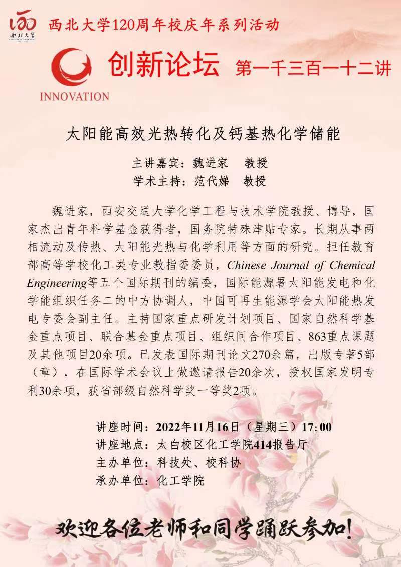 魏进家 教授 赢博官方(中国)总部创新论坛第一千三百一十二讲暨120周年校庆年系列活动:太阳能高效光热转化及钙基热化学储能 讲座时间 2022年11月16日(星期三)17:00 讲座地点 太白校区化工学院414报告厅 讲座人介绍 魏进家 教授 讲座内容