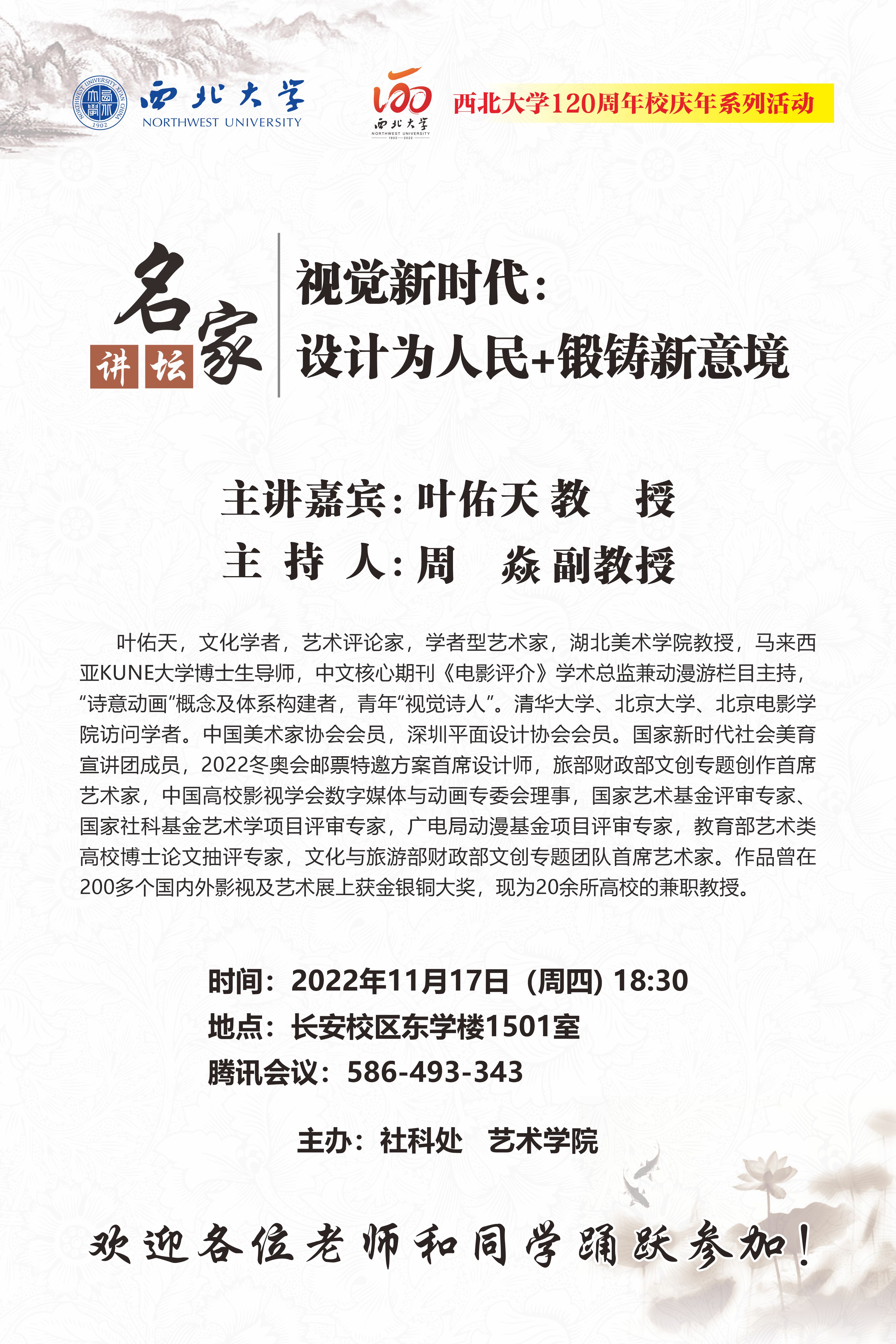 叶佑天 教授 赢博官方(中国)总部120周年校庆年系列活动:视觉新时代:设计为人民+锻铸新意境 讲座时间 2022年11月17日(周四)18:30 讲座地点 腾讯会议:586493343 讲座人介绍 叶佑天 教授 讲座内容