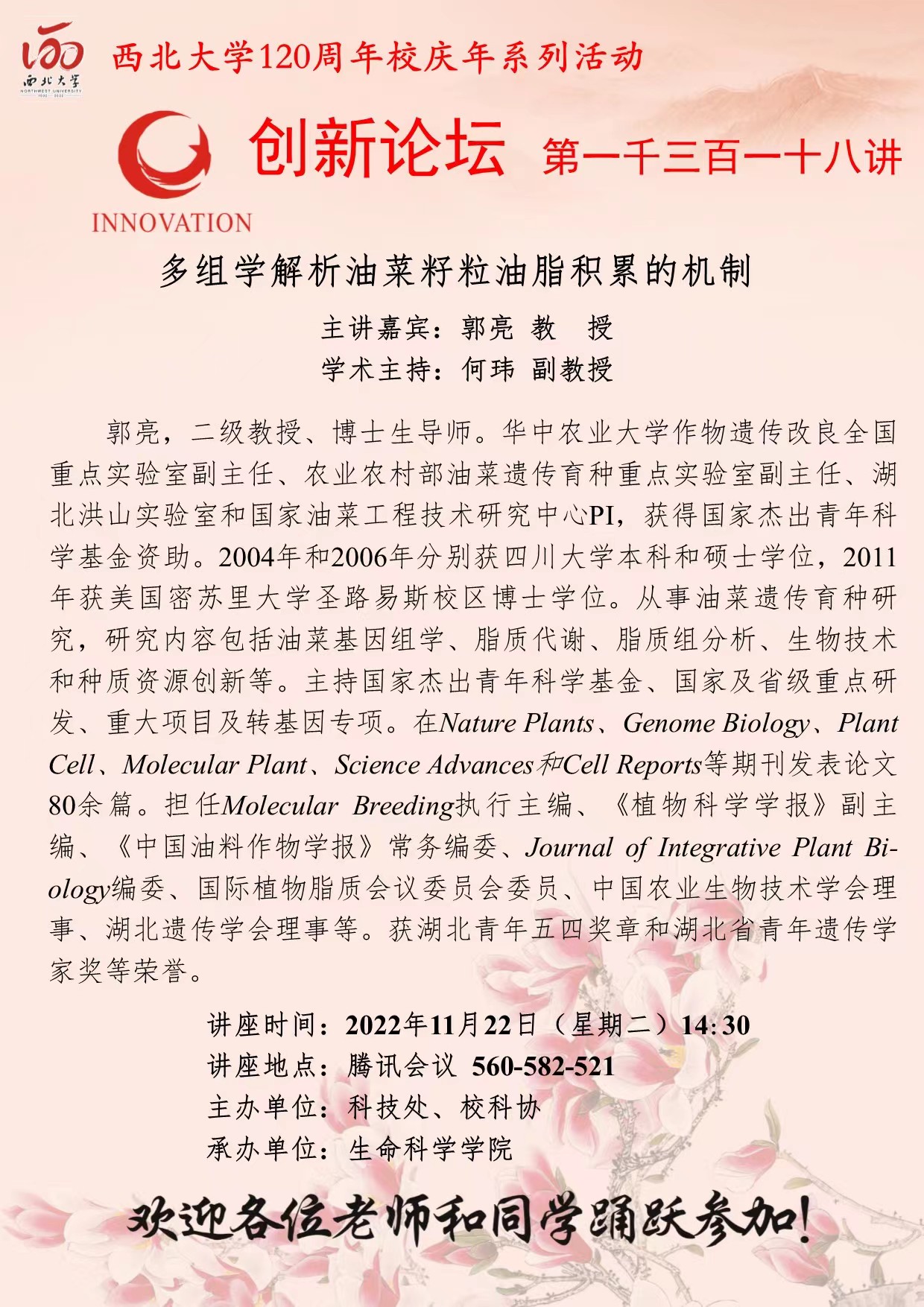 郭亮 教授 赢博官方(中国)总部创新论坛第一千三百一十八讲暨120周年校庆年系列活动: 多组学解析油菜籽粒油脂积累的机制 讲座时间 2022年11月22日(星期二) 14:30 讲座地点 腾讯会议 560-582-521 讲座人介绍 郭亮 教授 讲座内容