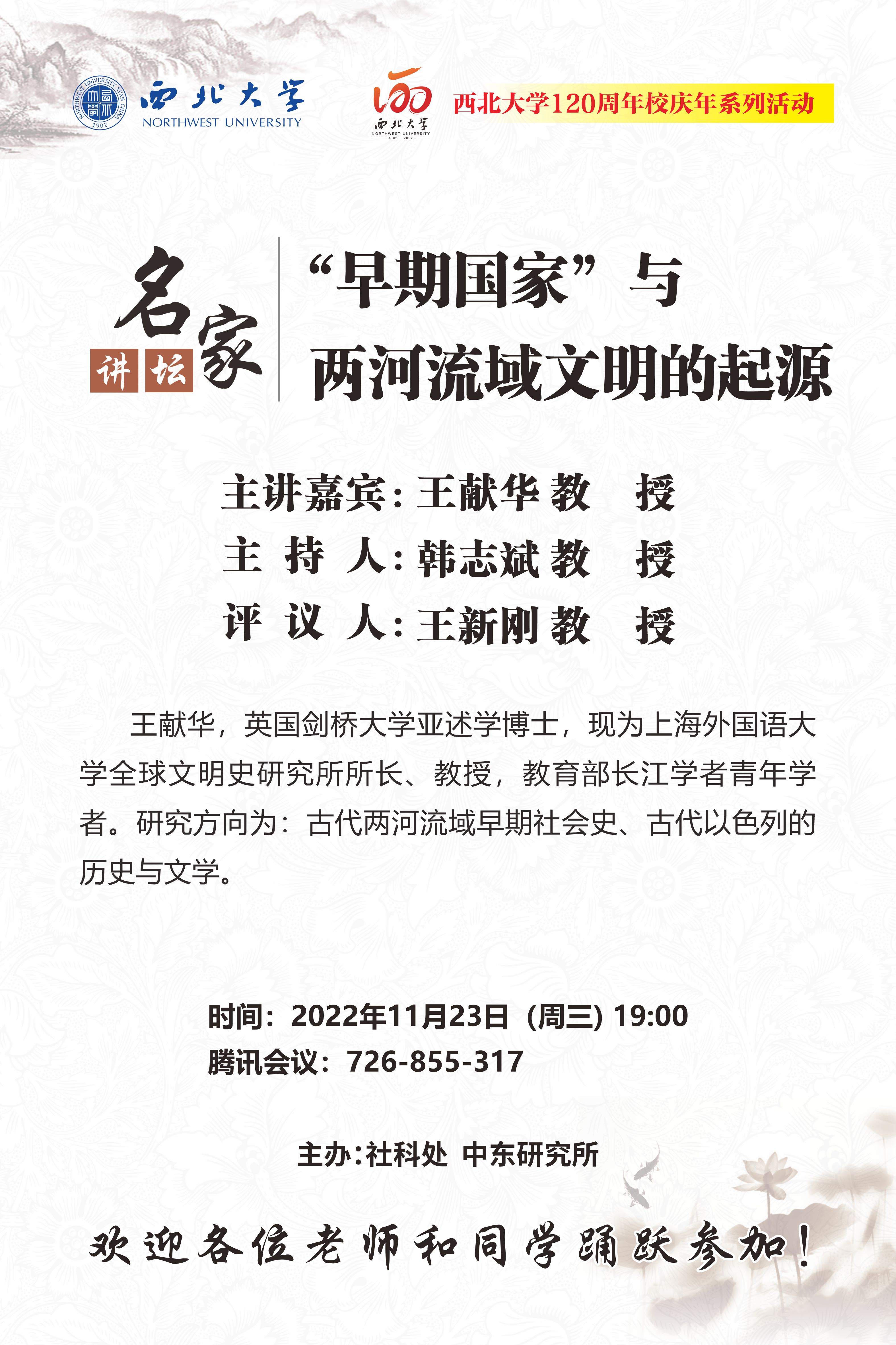 王献华 教授 赢博官方(中国)总部120周年校庆年系列活动:“早期国家”与两河流域文明的起源 讲座时间 2022年11月23日(周三)19:00 讲座地点 腾讯会议:726-855-317 讲座人介绍 王献华 教授 讲座内容