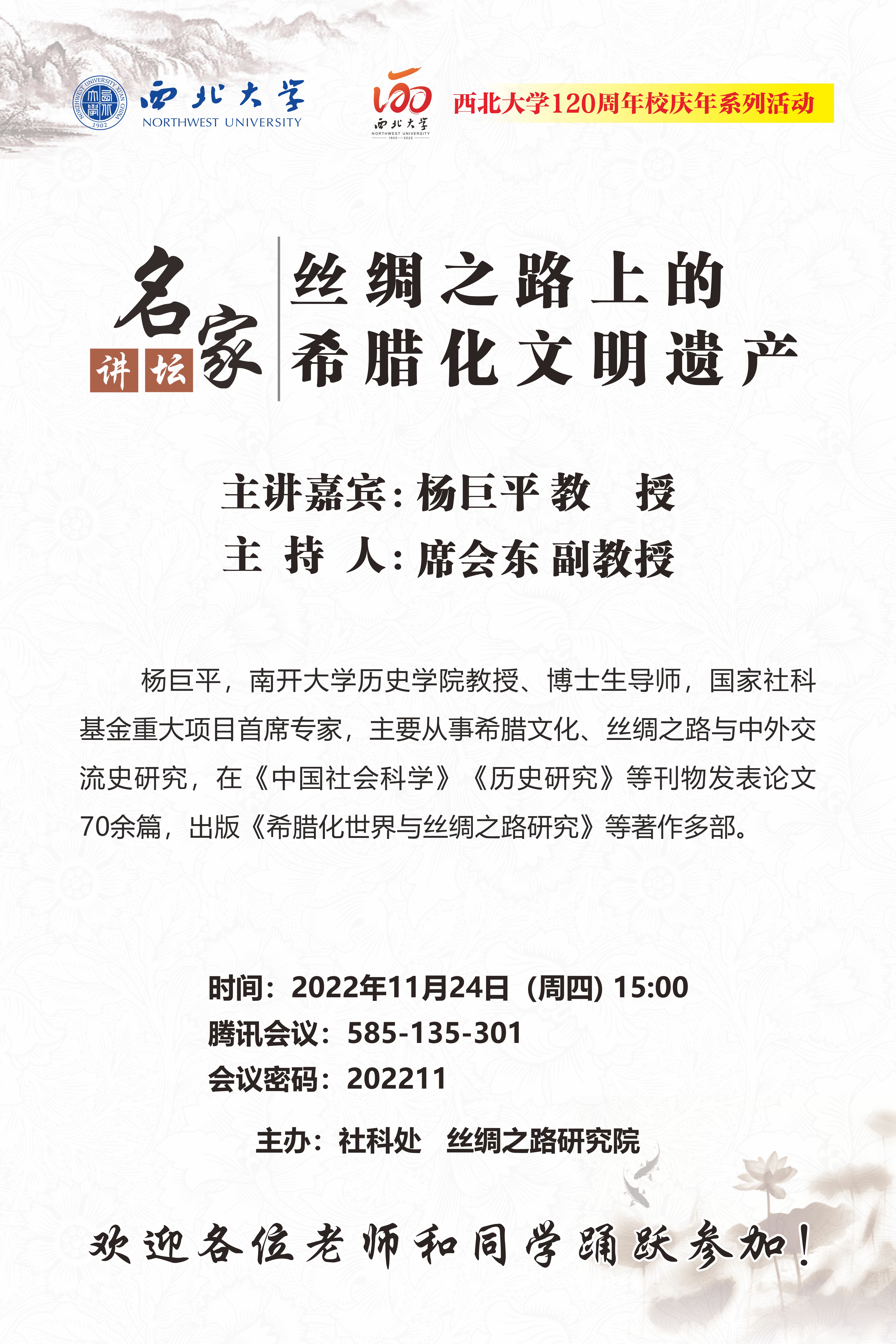 杨巨平 教授 赢博官方(中国)总部120周年校庆年系列活动:丝绸之路上的希腊化文明遗产 讲座时间 2022年11月24日(周四)15:00 讲座地点 腾讯会议:585-135-301 讲座人介绍 杨巨平 教授 讲座内容