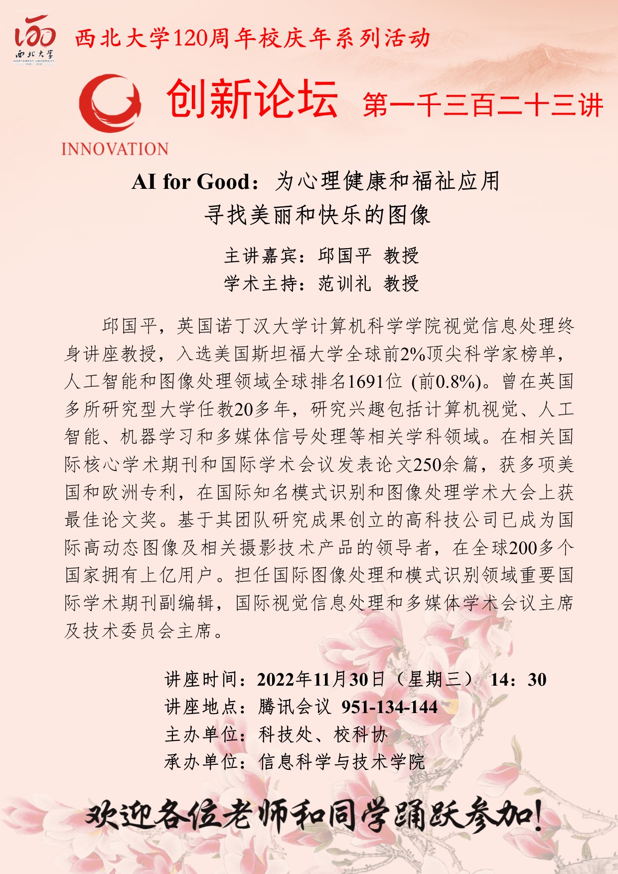 邱国平 教授 赢博官方(中国)总部创新论坛第一千三百二十三讲暨120周年校庆年系列活动:AI for Good:为心理健康和福祉应用寻找美丽和快乐的图像 讲座时间 2022年11月30日(星期三) 14:30 讲座地点 腾讯会议 951-134-144 讲座人介绍 邱国平 教授 讲座内容