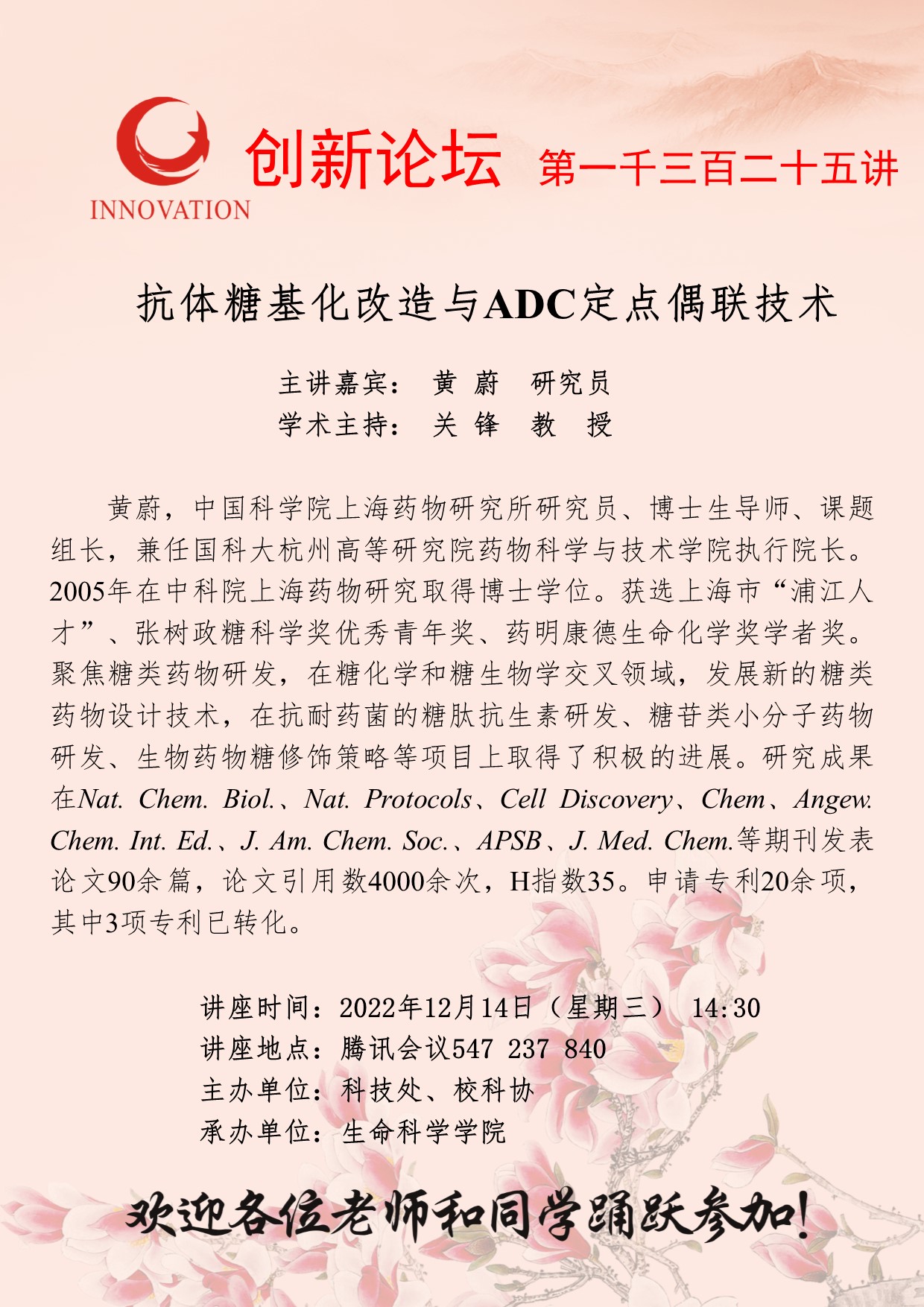 黄蔚 研究员 赢博官方(中国)总部创新论坛第一千三百二十五讲:抗体糖基化改造与ADC定点偶联技术 讲座时间 2022年12月14日(星期三) 14:30 讲座地点 腾讯会议547 237 840 讲座人介绍 黄蔚 研究员 讲座内容