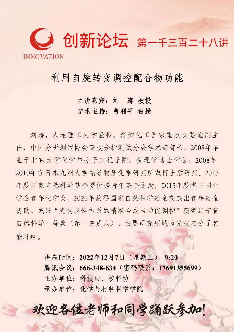 刘涛 教授 赢博官方(中国)总部创新论坛第一千三百二十八讲:利用自旋转变调控配合物功能 讲座时间 2022年12月7日(星期三) 9:20 讲座地点 腾讯会议:666-348-634 讲座人介绍 刘涛 教授 讲座内容