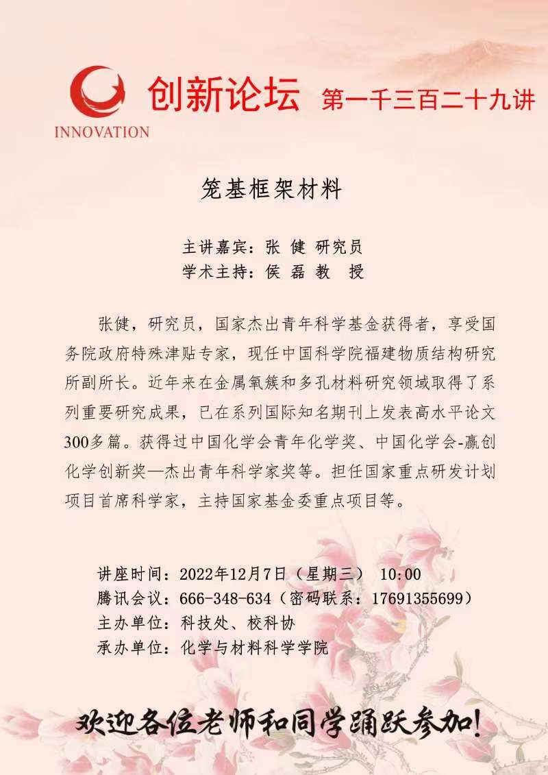 张健 研究员 赢博官方(中国)总部创新论坛第一千三百二十九讲:笼基框架材料 讲座时间 2022年12月7日(星期三) 10:00 讲座地点 腾讯会议:666-348-634 讲座人介绍 张健 研究员 讲座内容