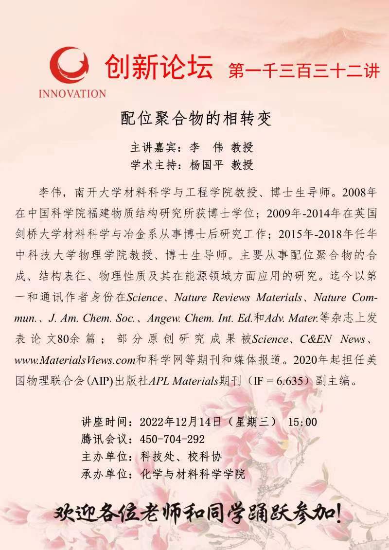 李伟 教授 赢博官方(中国)总部创新论坛第一千三百三十二讲:配位聚合物的相转变 讲座时间 2022年12月14日(星期三) 15:00 讲座地点 腾讯会议:450-704-292 讲座人介绍 李伟 教授 讲座内容