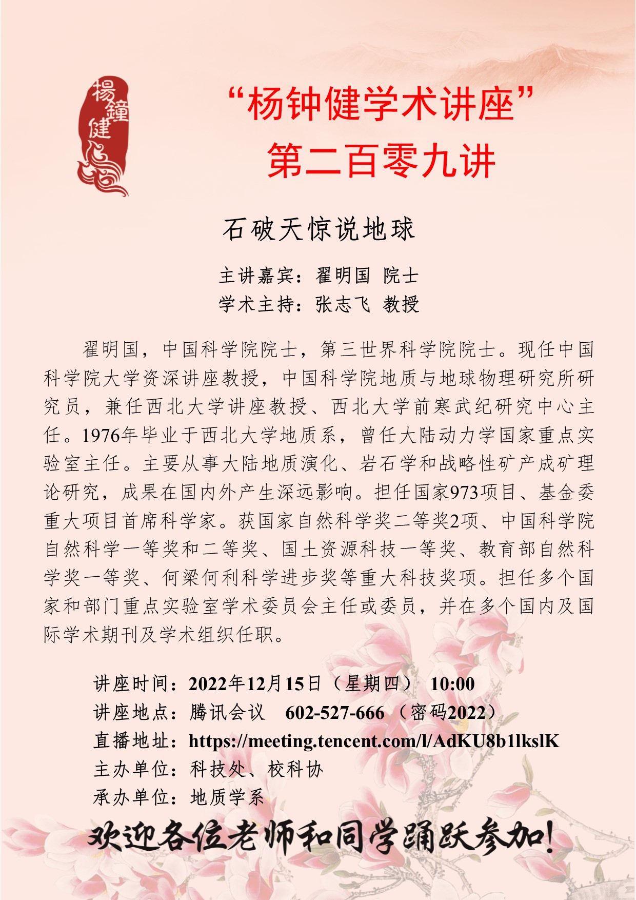 翟明国 院士 “杨钟健学术讲座”第二百零九讲:石破天惊说地球 讲座时间 2022年12月15日(星期四)10:00 讲座地点 腾讯会议:602-527-666 (密码2022) 讲座人介绍 翟明国 院士 讲座内容