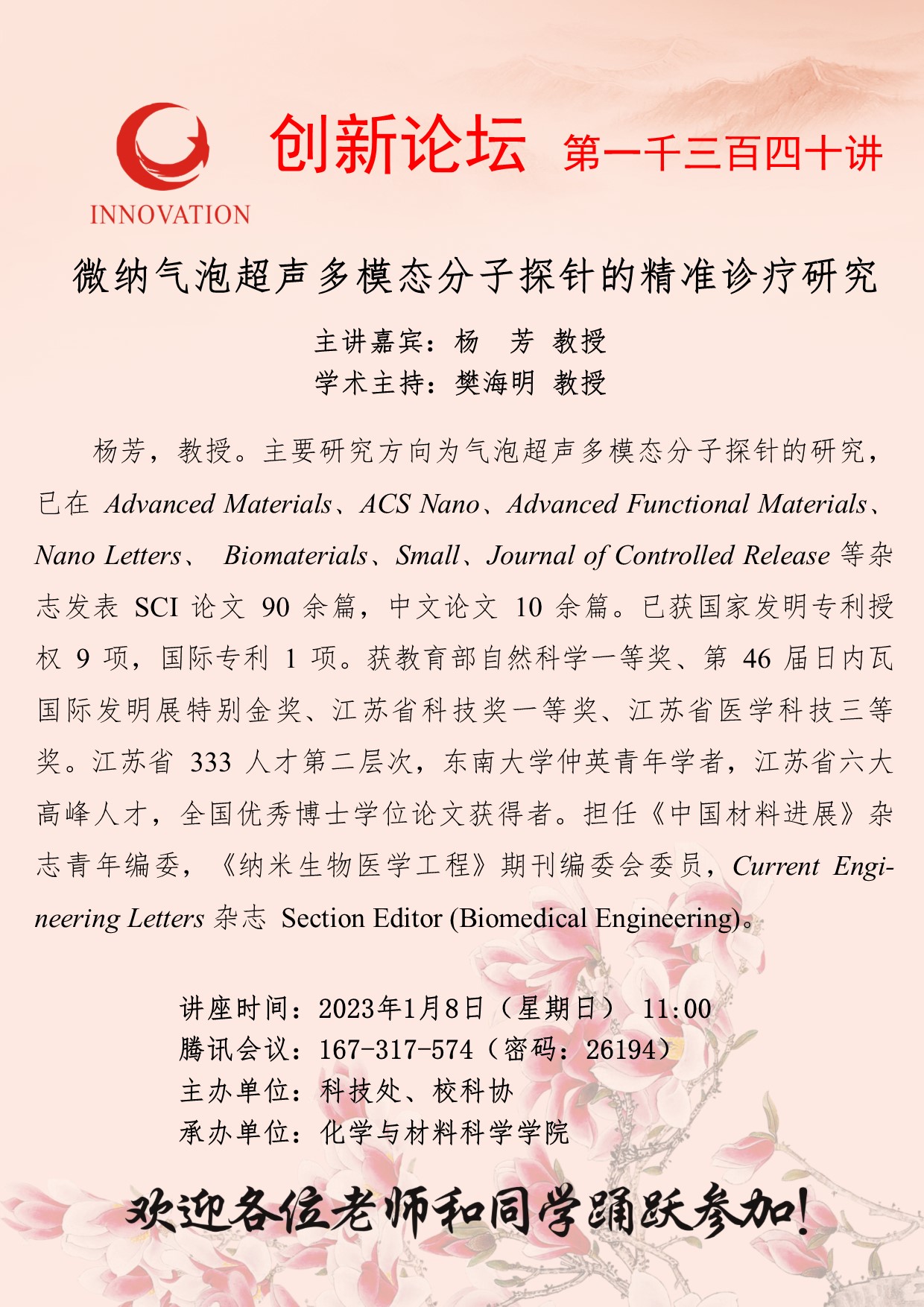杨芳 教授 赢博官方(中国)总部创新论坛第一千三百四十讲:微纳气泡超声多模态分子探针的精准诊疗研究 讲座时间 2023年1月8日(星期日) 11:00 讲座地点 腾讯会议:167-317-574 讲座人介绍 杨芳 教授 讲座内容