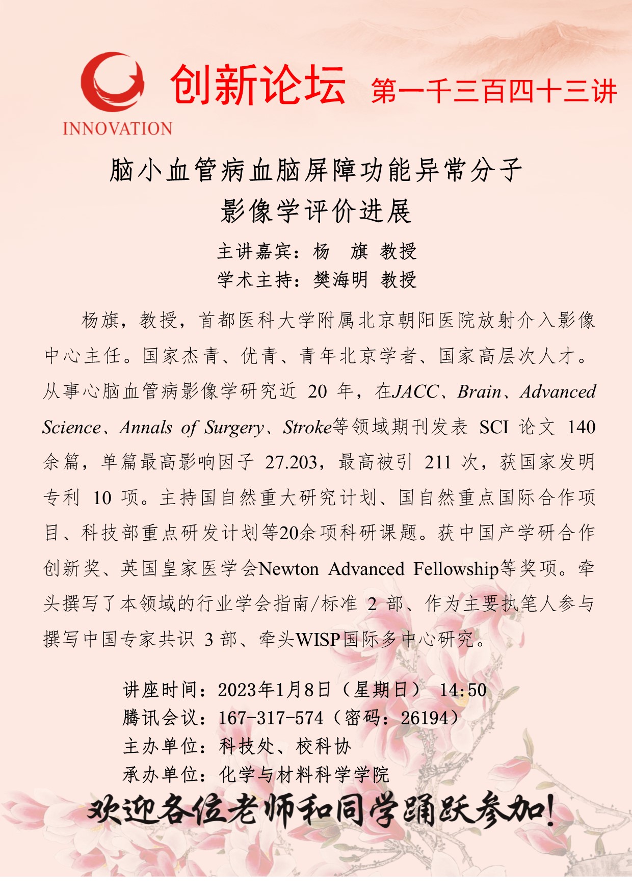 杨旗 教授 赢博官方(中国)总部创新论坛第一千三百四十三讲:脑小血管病血脑屏障功能异常分子影像学评价进展 讲座时间 2023年1月8日(星期日) 14:50 讲座地点 腾讯会议:167-317-574 讲座人介绍 杨旗 教授 讲座内容